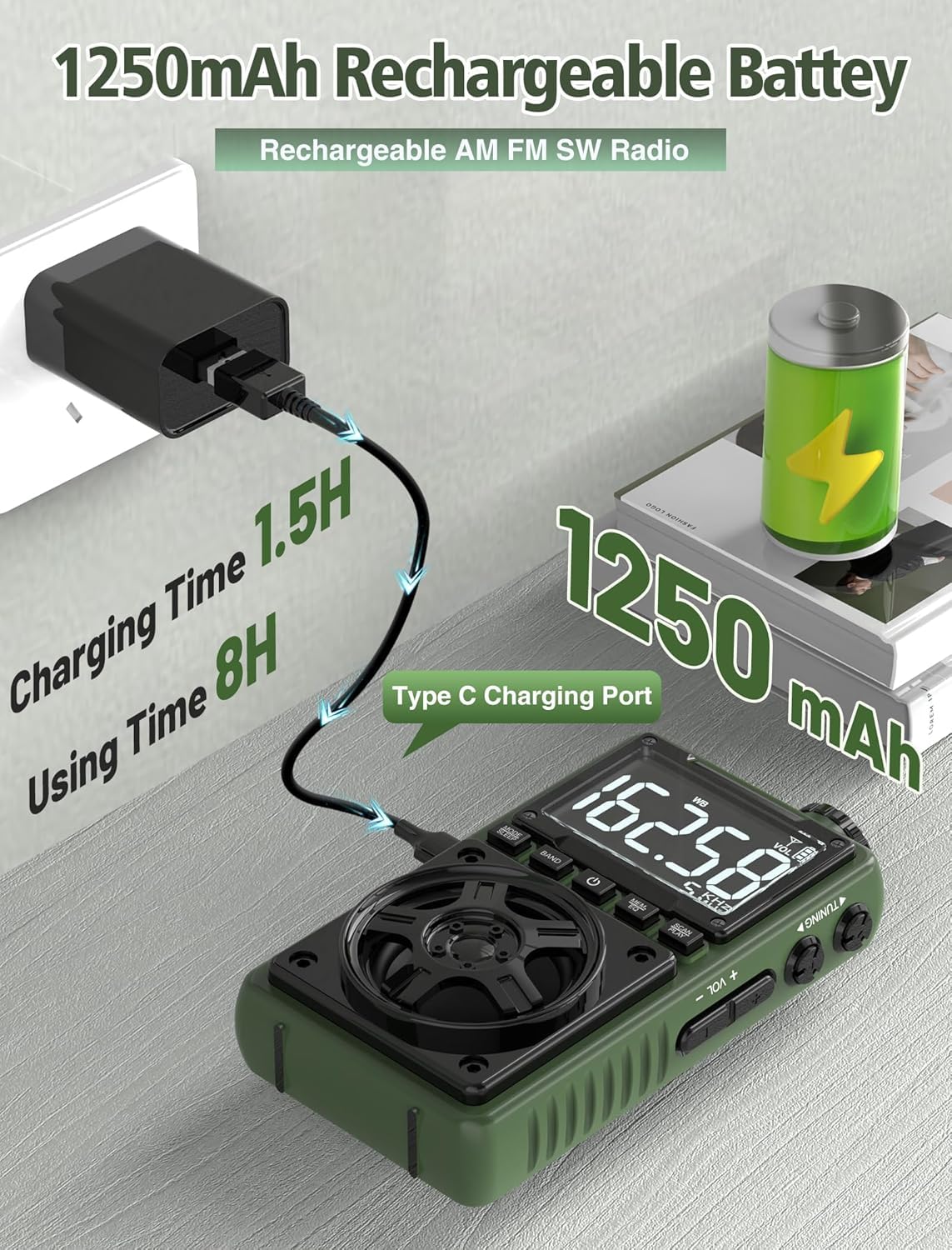 Q: How long does the rechargeable battery last on this portable radio?A: The radio features a powerful 1250 mAh rechargeable battery, providing up to 10-12 hours of playback on a single charge. This makes it ideal for outdoor activities such as camping or picnics.