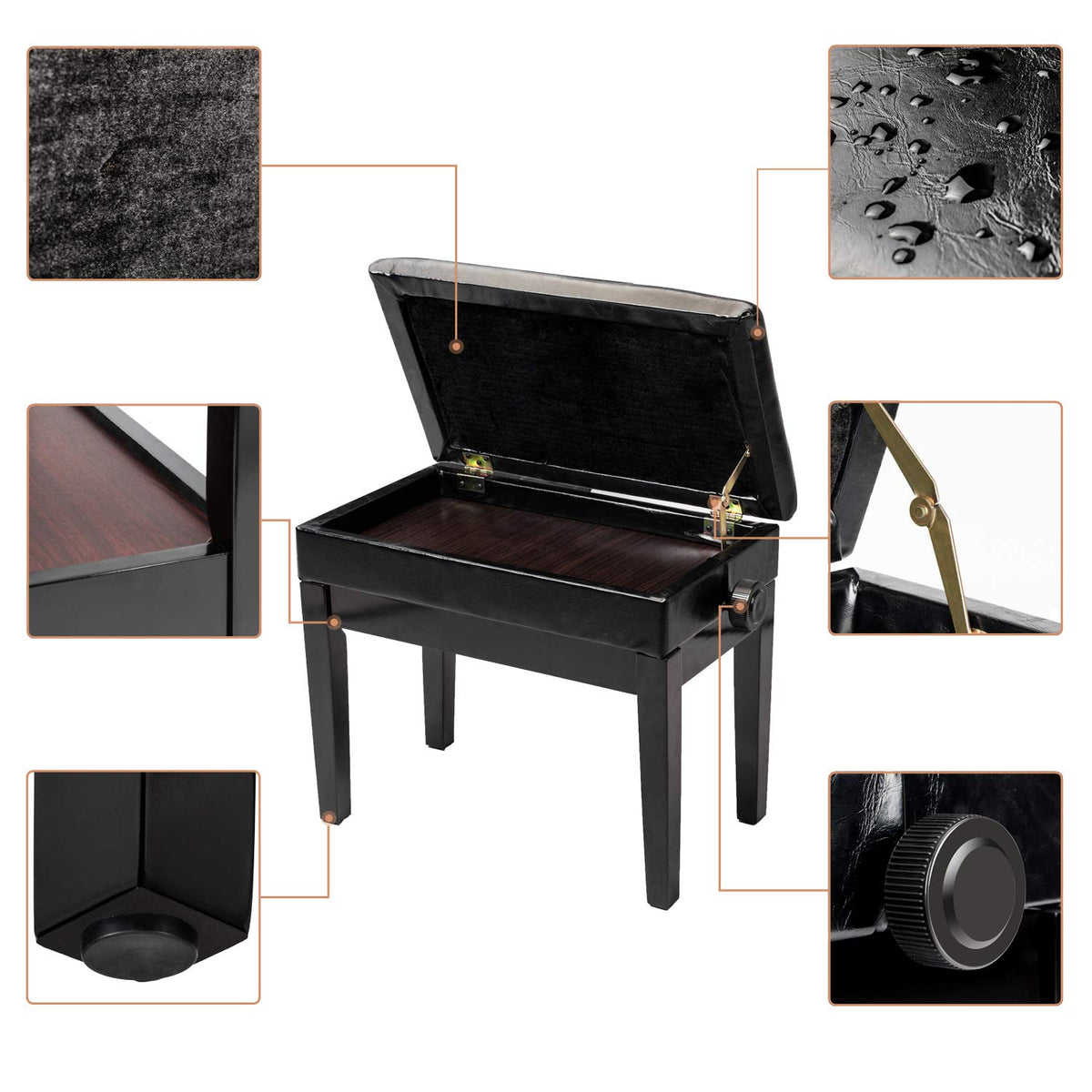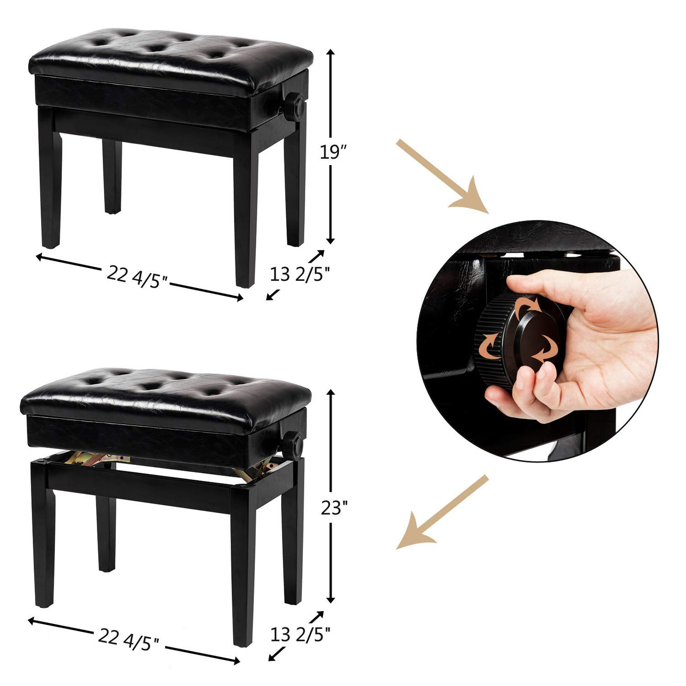 Bonnlo Height Adjustable Piano Bench With Attractive Styling And Ebony Finish Compliments Your Piano Keyboard Even Vanity Table With 2 Inches Thick Cushion, It Is So Comfortable And Allows You To Concentrate On Your Playing Tufted Top And The Shiny Paint On The Wooden Legs Makes It A Perfect Beautiful Piece Of Furniture In Your Music Room Features: - Easily Assembled - Large Storage Space Inside - Steady And Solid In Usage - Durable - Attractive In Looks - Equipped With A Good Raisinglowering Mechanism - Comfortable Specifications: - Color: Black - Upholstery Material: Faux Leather - Frame & Leg Material: Wood - Bench Weight: 20 Lbs - Weight Capacity: 330Lbs - Bench Size: 2283&Quotl X 1339&Quotw X 189&Quoth To 23&Quoth Package Includes: 1 X Piano Bench 1 X Manual 1 X Screw Kit Installation Tool