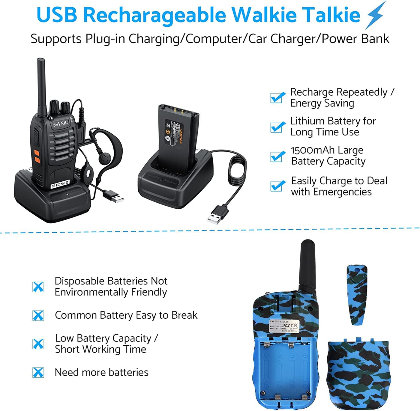 Q: How do I charge the batteries for the walkie talkies?A: The eSynic Walkie Talkies come with a USB cable version charger. Simply connect the walkie talkies to a power source using the provided charger to recharge the Li-ion batteries.