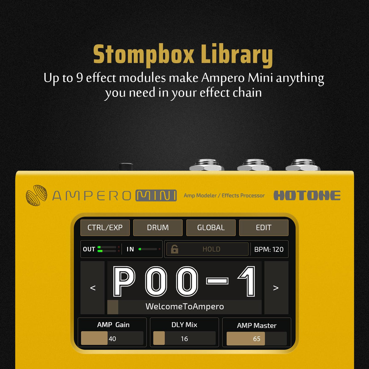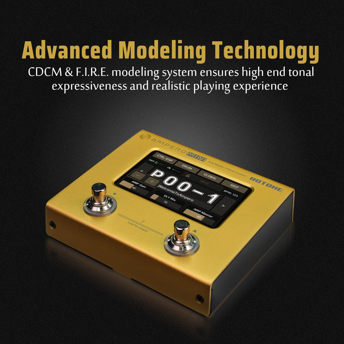 Ampero Mini Is The Smallest Guy In Our Ampero Family So Far, Offering You Uncompromised Ampero Sound In An Ultra Compact Aluminum Case It Has The Essentials Of Stunning Ampero Effects Armory With 3Rd Party Ir Support Onboard Essential Io Jacks Are More Than Enough For Daily Use, The Touch Screen And Intuitive Ui Ensures Smooth, Straight-Forward Experience On A Minimalized Chassis Ampero Mini Will Offer You Excellent Performance On The Money, Especially For Players Who Want To Experience Ampero Tone, Rookies On A Budget, Session Musicians Who Need Both Ultra-Compact Size And Pro Tone, Even Experienced Amp Modeler Players Features Ultra Compact Amp Modeler & Effects Processor Powerful Dual-Core Dsp Platform Ensure Ampero-Grade Tone Quality Cdcm & Fire Modeling System Ensures High End Tonal Expressiveness And Realistic Playing Experience 24-Bit Signal Processing, 112Db Sn Ratio Iconic Touch Screen Operation And Straight-Forward Ui For Intuitive Control Editable Effect Chain Usb-C Port For Firmware Upgrading, Loadingeditingmanaging Effectsirs Via Free Macpc Software Or For Use As An Usb Audio Interface Up To 9 Simultaneous Effect Modules Selected Effects From Stunning Ampero Effects Library Including: - 100+ Cdcm Hd & Fire Based Amp, Cab, Legendary Pedal Models - Next-Gen Mic Position And Microphone Type Simulations - Selected Hotone Original Effects (Drivenamicfiltermoddelayreverb Models And More) User Custom Ir Loader With 3Rd Party Ir Support Specially Designed Input Jack For Both Electric And Acoustic Instruments 198 Presets Ampero-Style Acoustic Effects And Patches Built-In Drum Machine With 100 Patterns Built-In Looper With Max 100 Seconds Recording Time Authentic Stereo Output Processing External Controller Jack For Connecting External Footswitchespedals Custom
