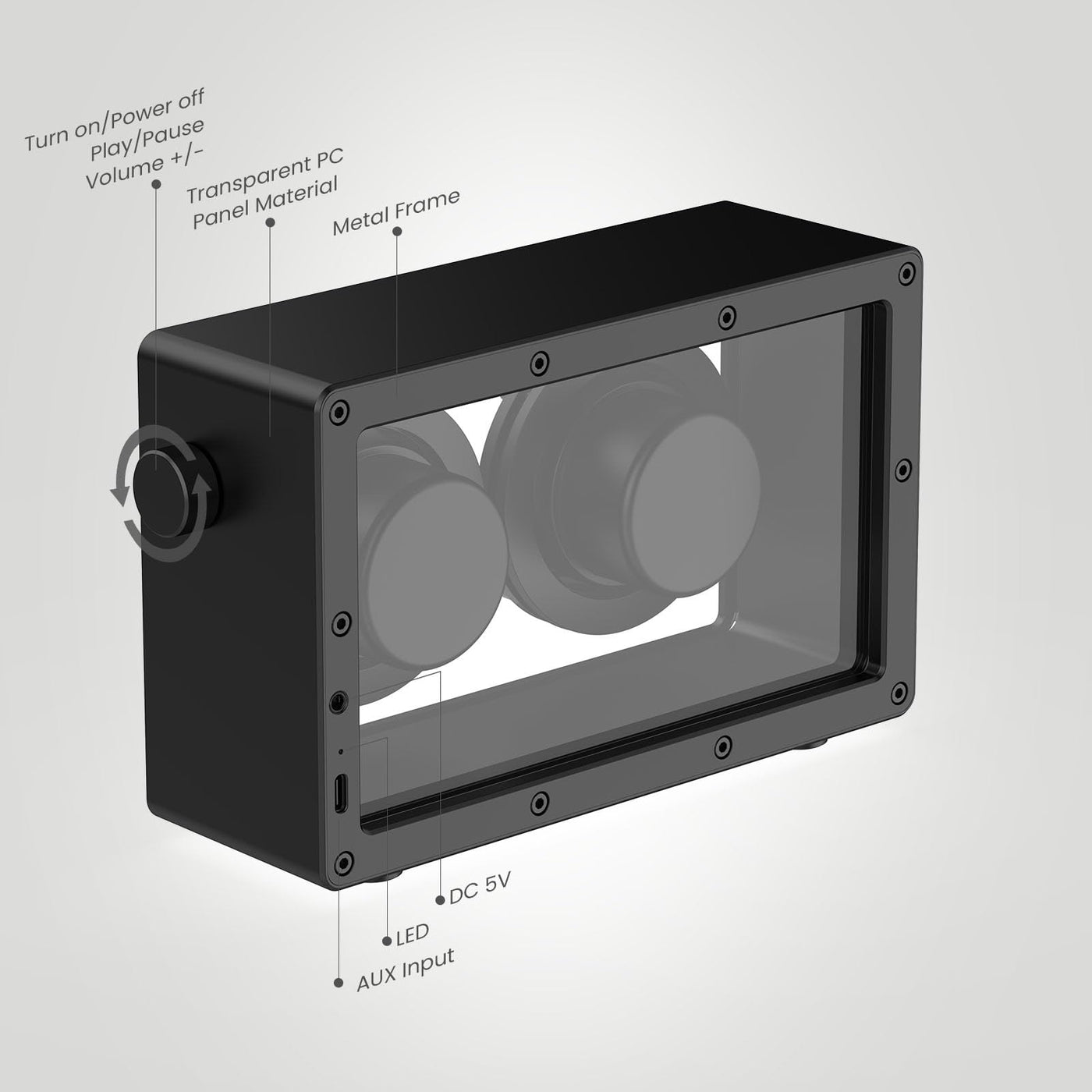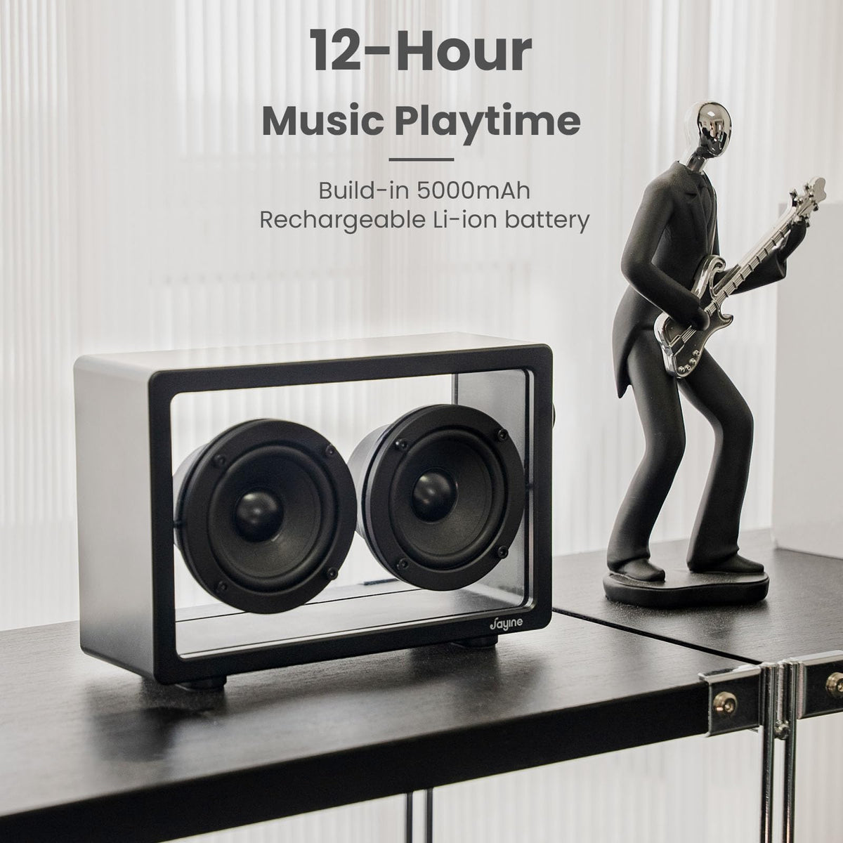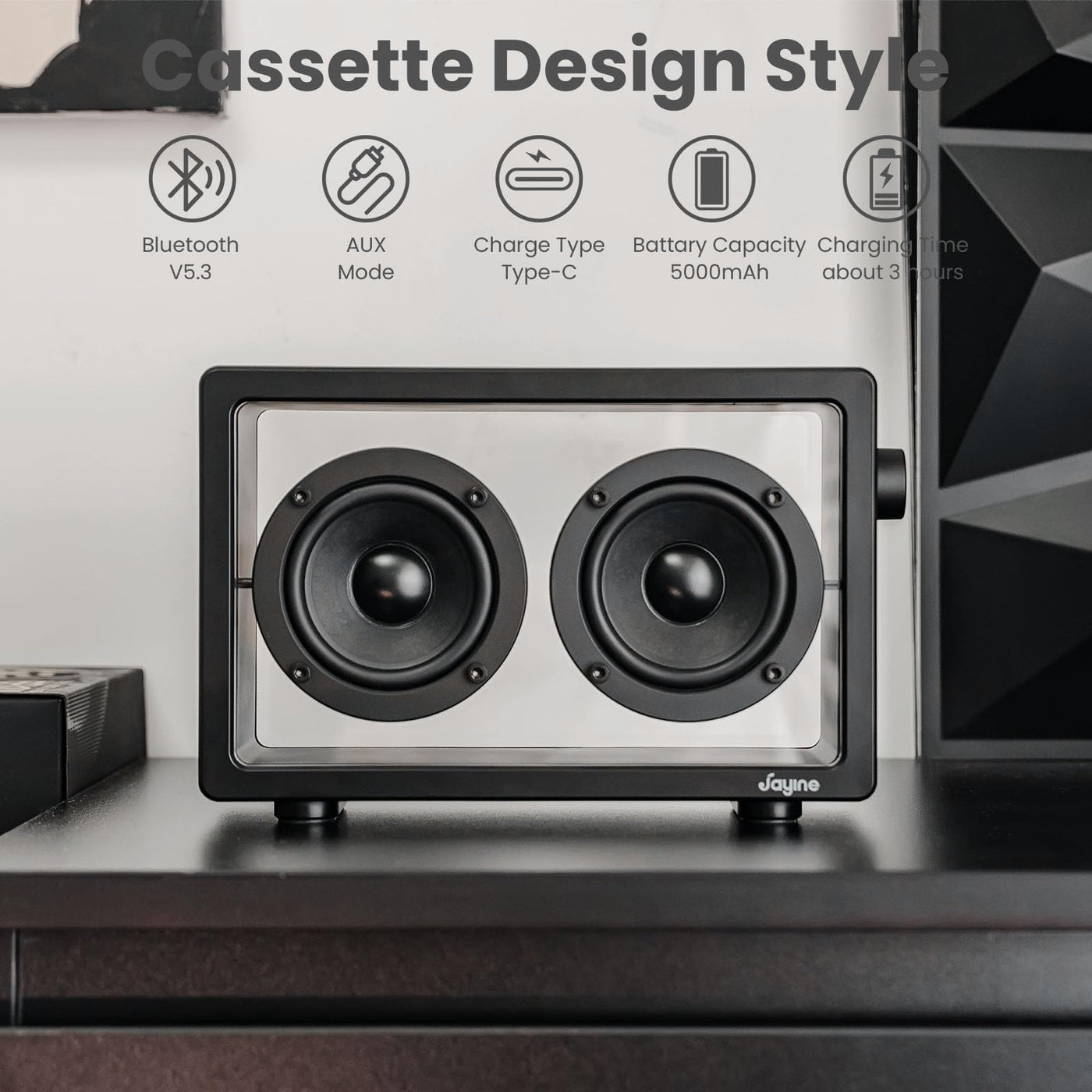Q: What makes the design of the JAYINE speaker unique?A: The JAYINE Cassette Portable Bluetooth Speaker features a transparent design made of high-quality plexiglass and a polycarbonate outer frame, making it not only fashionable and elegant but also durable and long-lasting, perfect for a tasteful lifestyle.