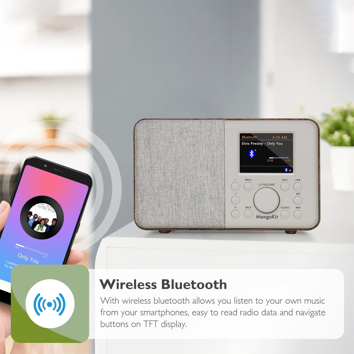 Mangokit Sr10 Portable Wifi Internet Radio, Fm Digital Radio,Batteries Or Mains Powered,Headphone-Output,Wireless Bluetooth Speakers,Alarm Clock, Sleep Snooze Timer, Colour Display,For Home & Outdoor(Walnut)