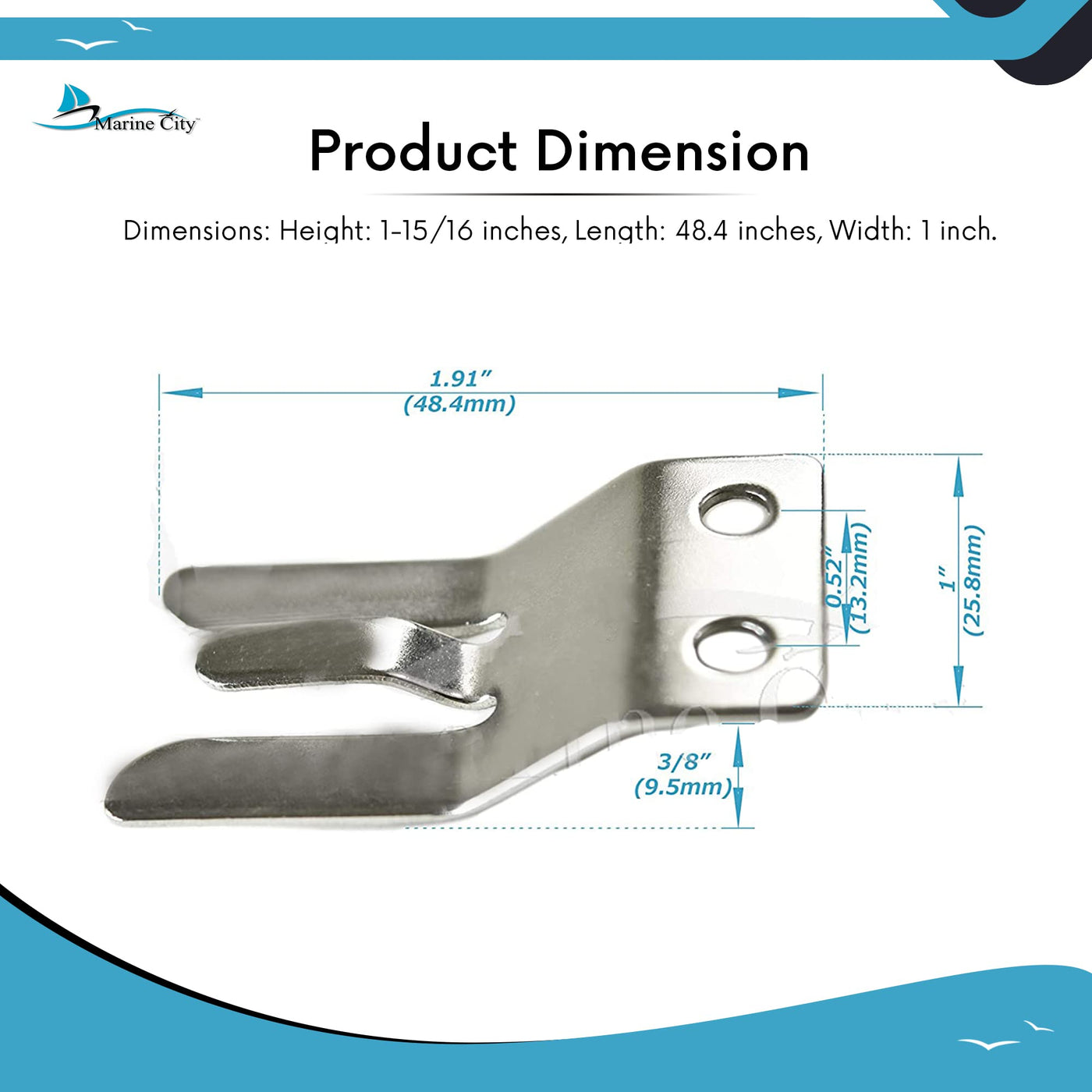 Q: What are the dimensions of the MARINE CITY microphone clip?A: The dimensions of the MARINE CITY Handheld Microphone Hang-Up Clip are as follows: Height: 1-15/16 inches, Length: 48.4 inches, Width: 1 inch.