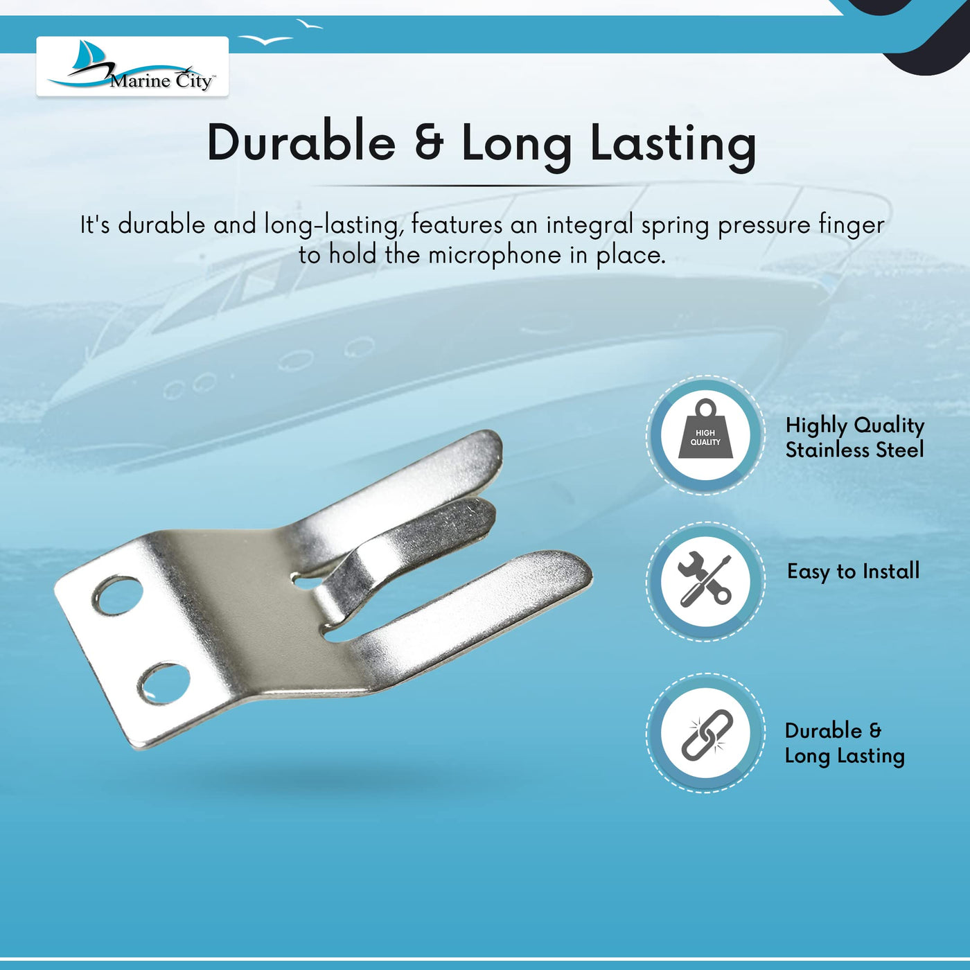 Q: How do I install the MARINE CITY microphone clip?A: The installation is straightforward and requires basic hardware. The clip can be easily mounted in your desired location, allowing for quick access to your handheld microphone.