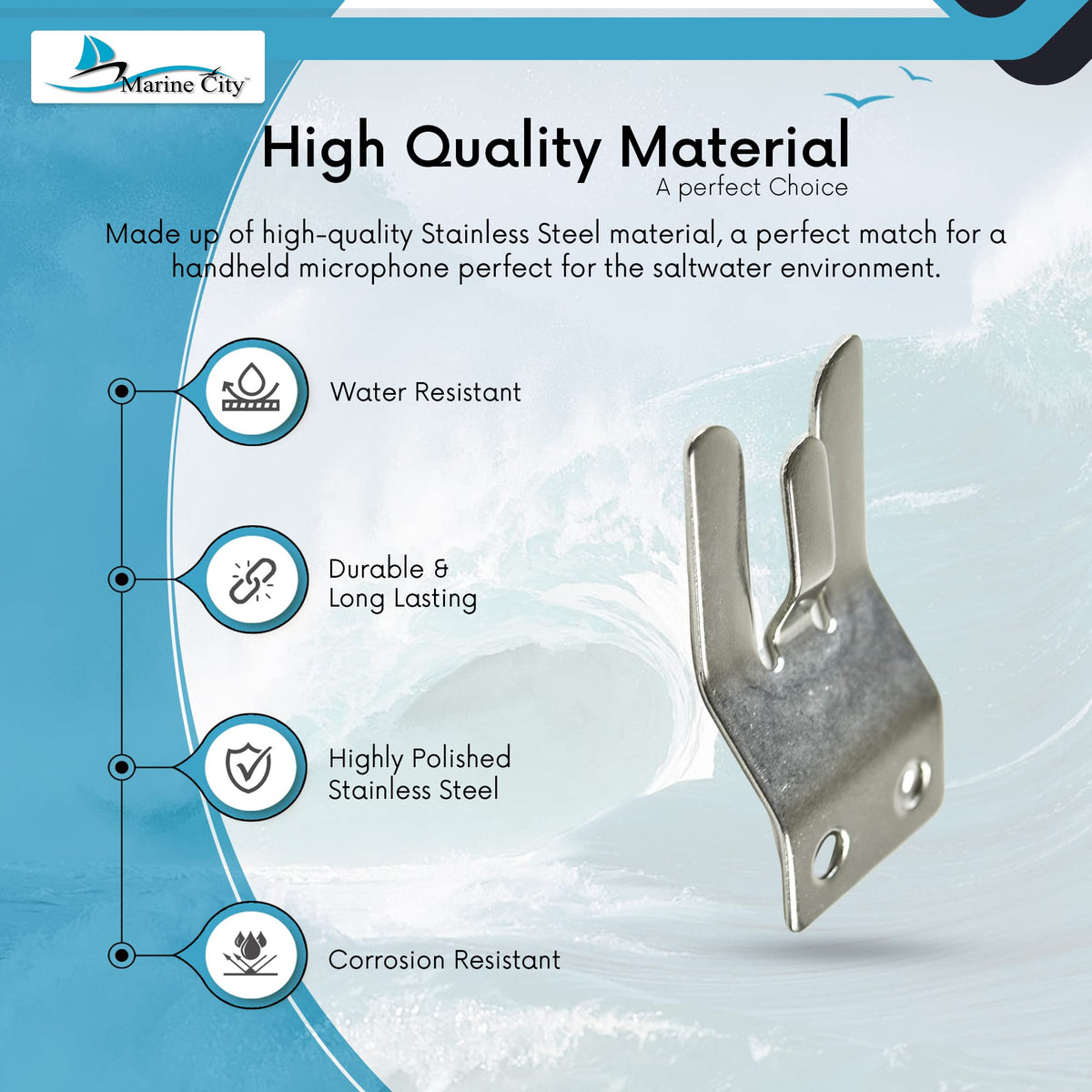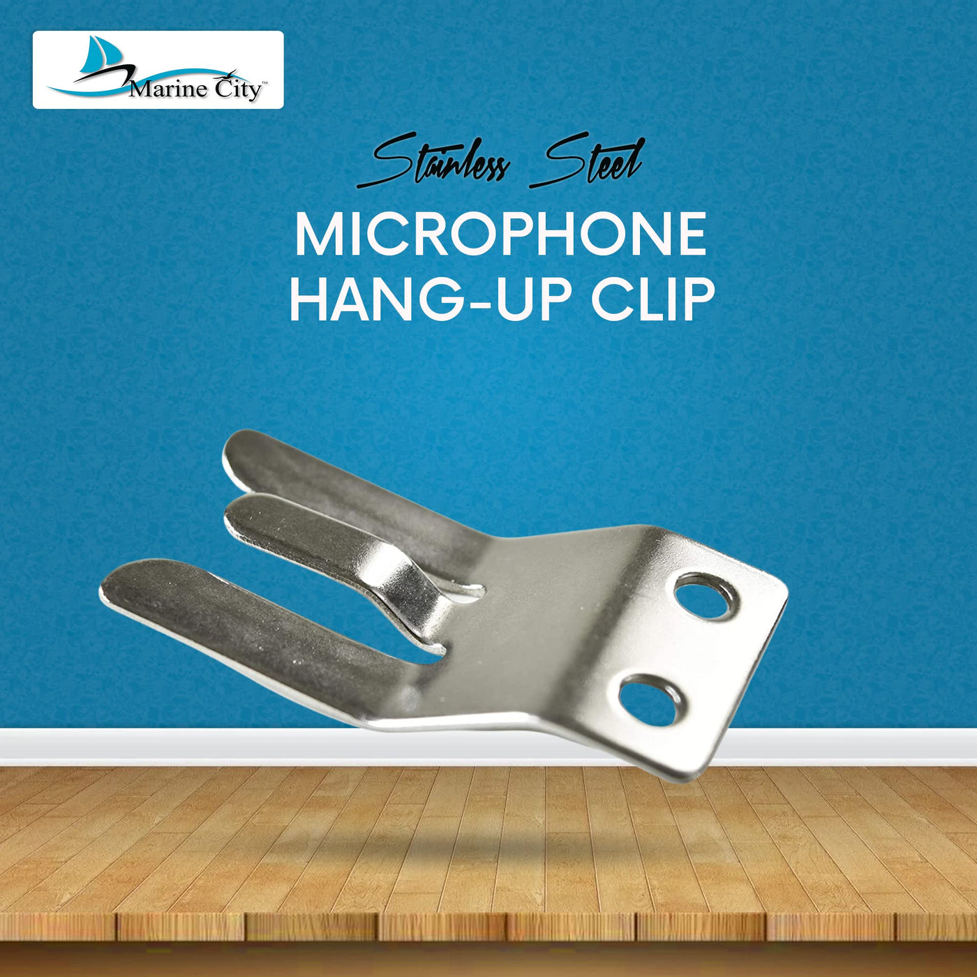 Q: What material is the MARINE CITY Handheld Microphone Hang-Up Clip made from?A: The MARINE CITY Handheld Microphone Hang-Up Clip is made from high-quality stainless steel, ensuring durability and resistance to corrosion, making it ideal for use in saltwater environments.