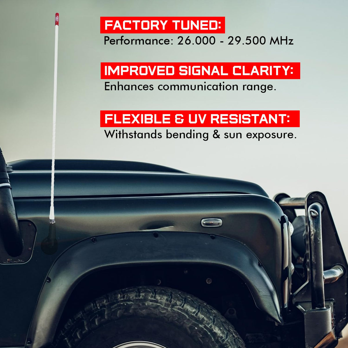 Q: What frequency range does this antenna cover?A: This antenna is factory-tuned to operate within the frequency range of 26.000 to 29.500 MHz, ensuring compatibility with most CB radio systems.