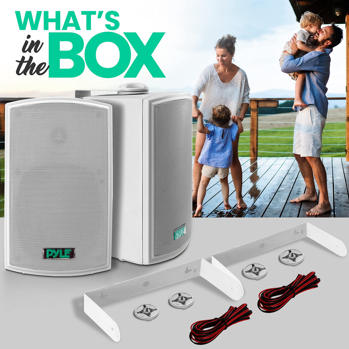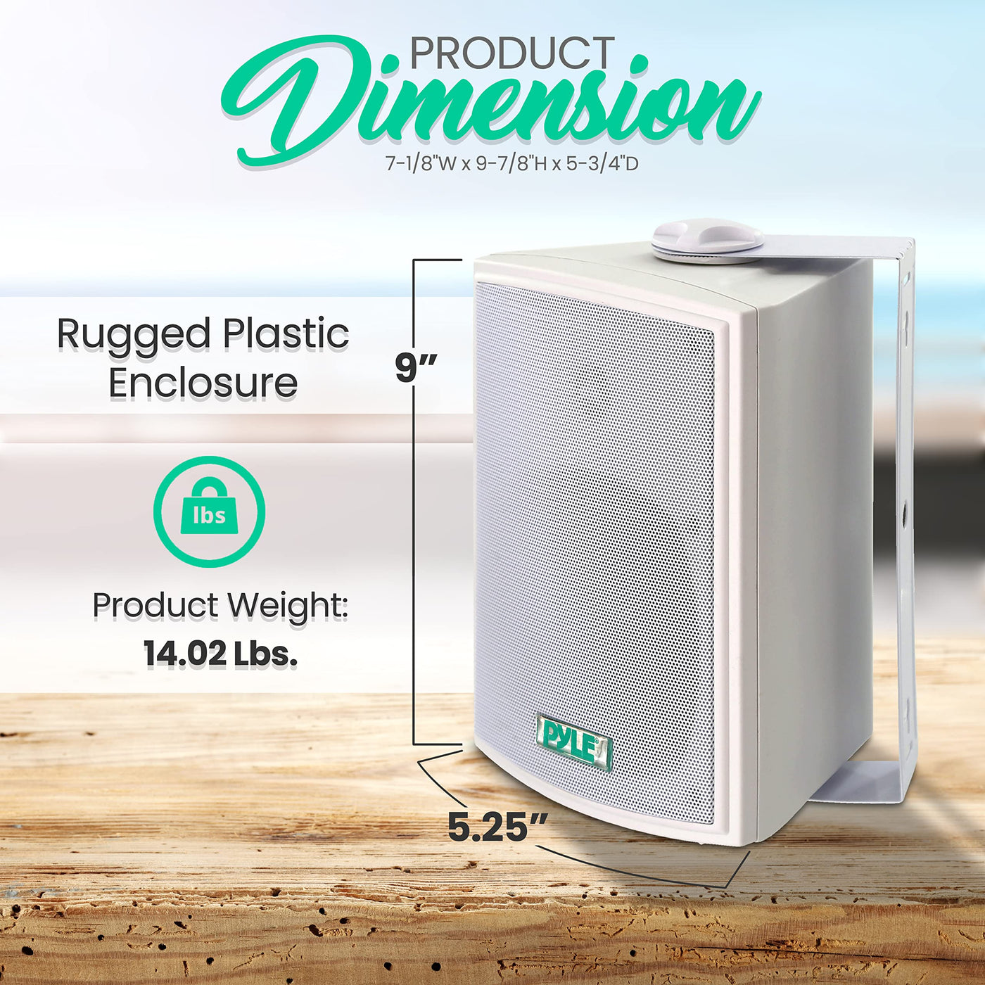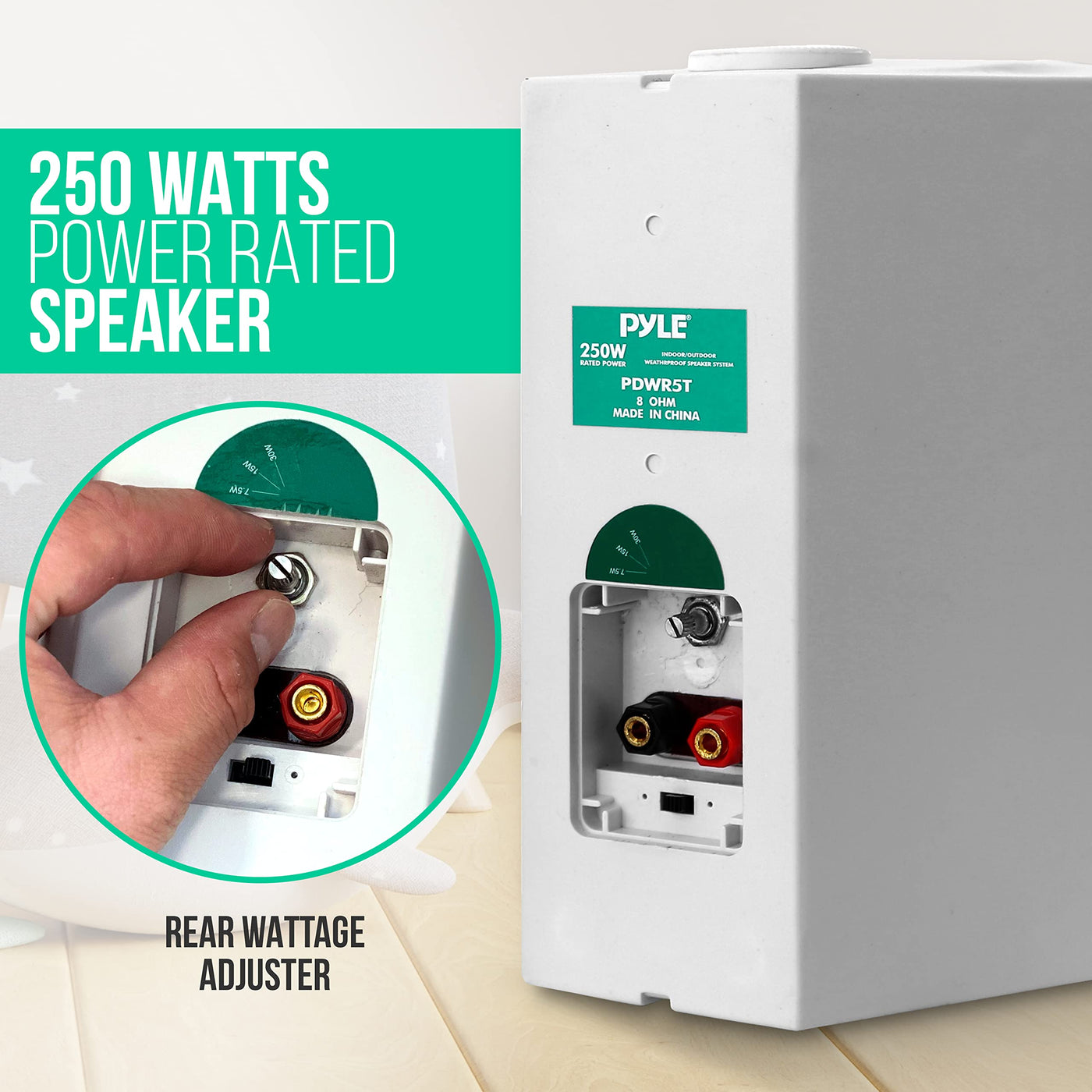 Pylehome Model : Pdwr5T5.25'' Indoor/Outdoor Speakers5.25'' Indoor/Outdoor Waterproof Speakers W/30 Watt 70V Transformerrugged Plastic Enclosure 5.25'' Long Throw Woofer W/ 40Oz Magnet 1/2'' Polyamide Dome Tweeter 125 Watts Rms/250 Watts Power Frequency Response: 85Hz-20Khz Average Sensitivity: 92Db @ 1W/1M 8 Ohm Impedance Spring Loaded U Mounting Brackets Included 30 Watt 70V Transformer Tapping At: 7.5W, 15W And 30W Indoor/Outdoor Equalization Switch Dimensions: 7-1/8''W X 9-7/8''H X 5-3/4''Dthese White Pyle Indoor/Outdoor Waterproof Speakers Are Excellent For Use On Boats, Decks, Patios, Or By The Pool - Anywhere Outdoors. And They'Re Compatible With 70 V Pa Systems - This Model Includes Built-In Transformer Tappable At 3.75, 7.5, And 15 Watts. They'Re Completely Waterproof, Thanks To The Rugged Plastic Enclosure. And They'Re Powerful - 250 Watts Max. A 5.25' Long Throw Woofer With 40 Oz. Magnet Provides The Midbass, While A ' Polyamide Dome Tweeter Pushes Sweet Highs. These Speakers Deliver A Frequency Response Of 85 Hz To 20 Khz. Mount Using The Included Spring Loaded U-Mounting Brackets. Sold As A Pair.