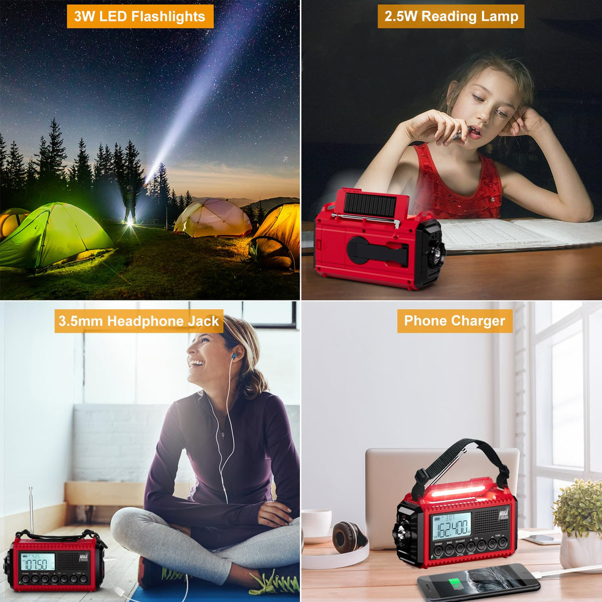 Q: What safety features does this emergency radio include?A: The Raynic Emergency Radio is equipped with a super-bright 3W flashlight, a 2.5W reading lamp, and an SOS alarm that activates a loud alert and flashing red light for emergency assistance. These features are essential during power outages or emergency situations.