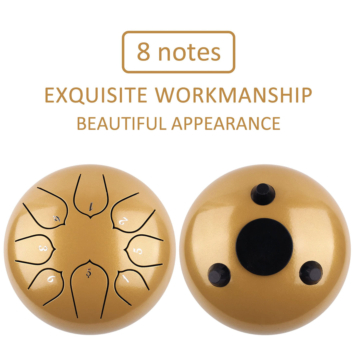 Good Design: Lotus Flower Tongue, It Is Simple In Structure,The Sound Is Very Pleasant And It Is A Kind Of Sound Like Buddhas Toneseasy To Learn, Even Beginners Can Easily Master And Play Wonderful Music Methods Of Enjoying: Playing With Mallets--Hold The Mallet Lightly And Let It Drop And Bounce Off The Note Playing With Hands--To Achieve The Hand Playing Technique, Use The Pad Of Only One Finger To Strike The Note Playing With Picks-- Pick Is Another Way To Create The Ideal Tone, If You Are Familiar With Drum, You Can Have A Try Size: 8Notes6Inch-114 X 75 X 67 Inches,Weight:154Lb Products In The Package: A1 X Steel Drum A1 X Pair Of Mallets A1 X Music Book A1 X Bag A1 X Set Of Notes Stickers A1 X Set Of Picks Q&A: What If The Instrument Out Of The Tune: First Of All,The Steel Drum Is Non-Fixed Instrument,It Is A Normal Phenomenon 10 Pointsthe Steel Tounge Drum Can Be Adjusted By Fine-Tuning:Pitch Down By Pressing The Tongue For Overtone,Or By Using A File With Grinding To File It Down At The Root Of The Tongue,And The Tone Will Be Lowered If It Is Low Tone, Please Top Up The Tongue From Its Bottom
