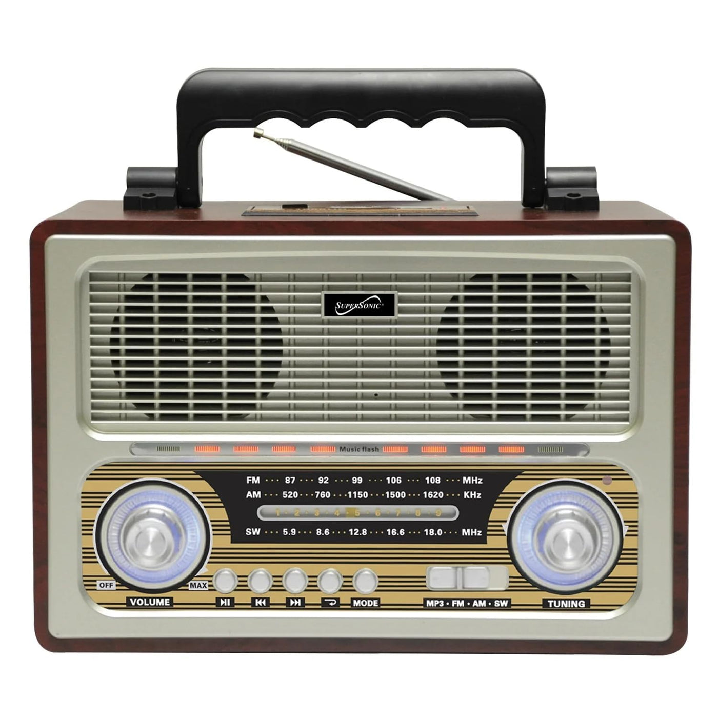 Q: What are the key features of the Supersonic SC-1198BT Vintage Retro Bluetooth Speaker?A: The Supersonic SC-1198BT features a vintage retro design, built-in Bluetooth receiver for wireless connectivity, high-performance speakers for superior sound quality, a multi-band AM/FM/SW radio, and multiple input options including USB and SD. It also has a rechargeable battery and works on both AC and DC power.