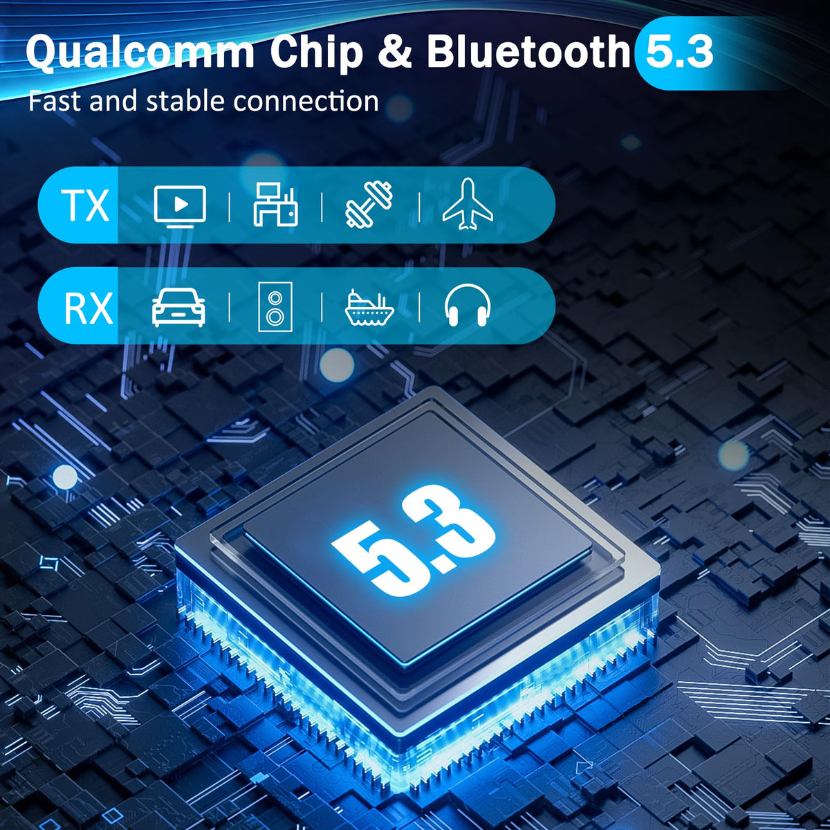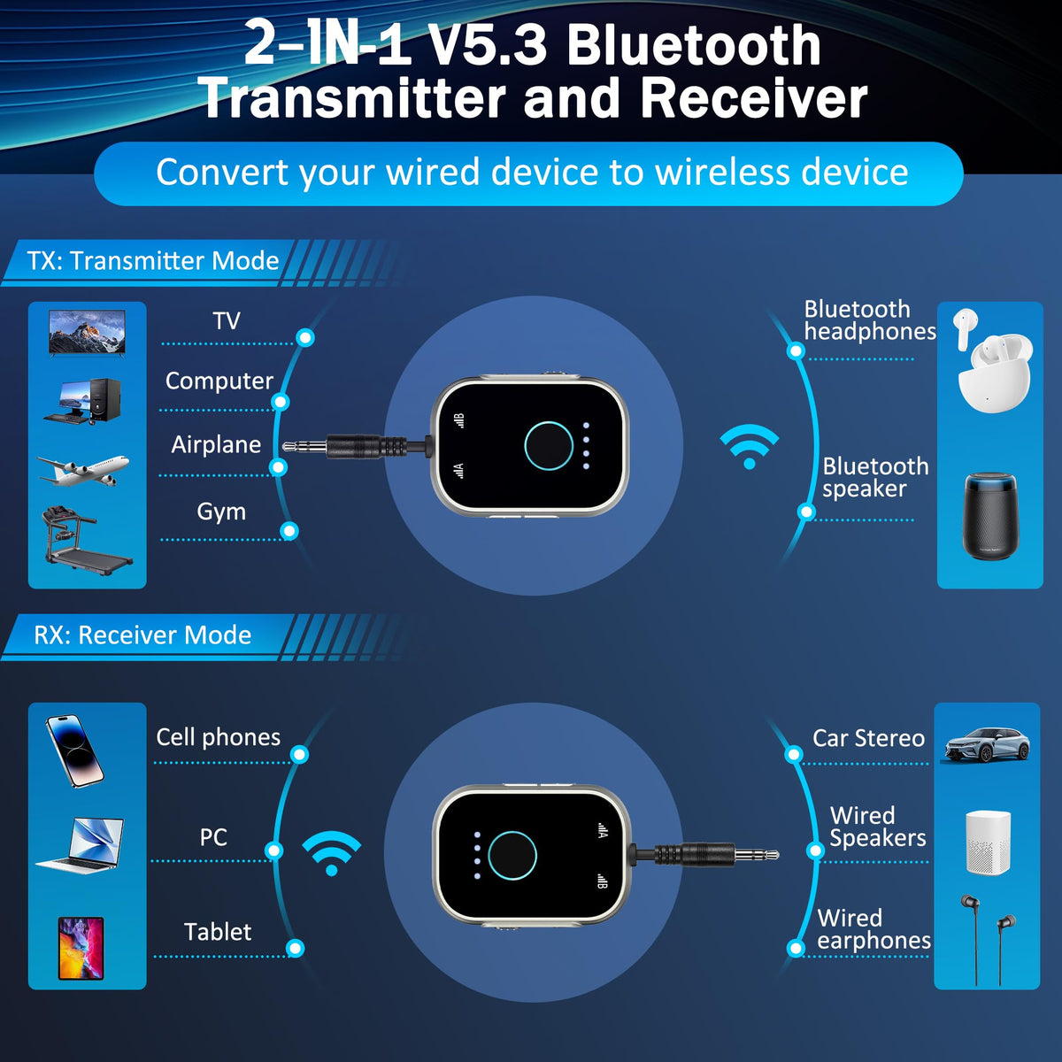 Swiitech Bluetooth Audio Transmitter Receiver, 2-In-1 Bluetooth 5.3 Adapter For Tvs, Airplane, Gym Equipment, Cars, For Up To Two Wireless Headphones, Cell Phones.