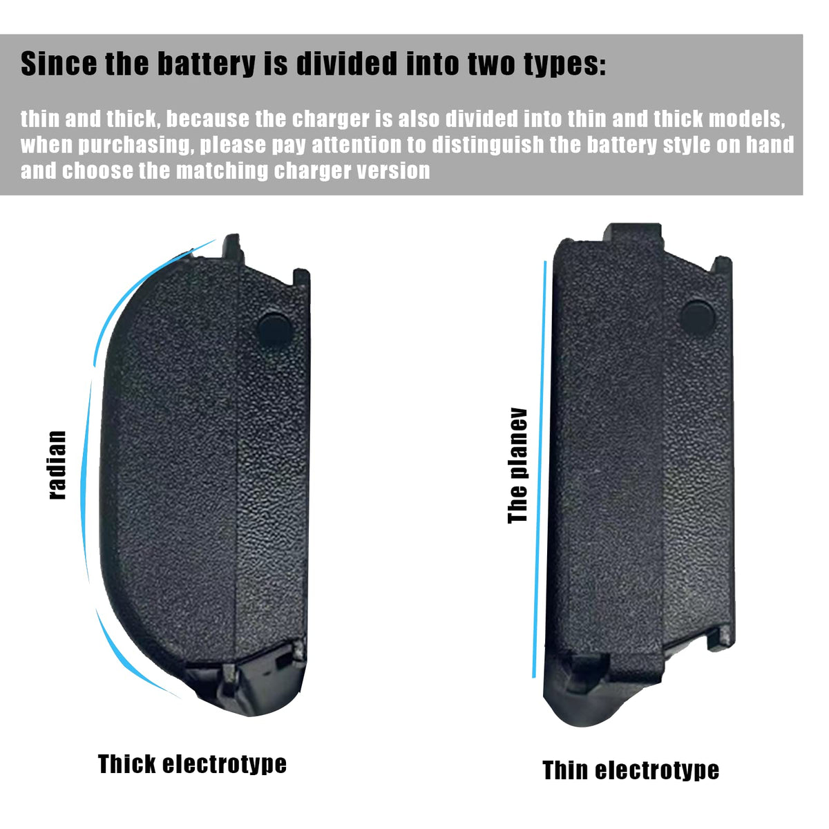 Q: How can I determine if I need the thin or thick version charger?A: To determine whether you need the thin or thick version charger, inspect the battery shape. If the battery has a curvature, it is the thick version; otherwise, it is the thin version. This distinction is crucial for selecting the correct charger model.