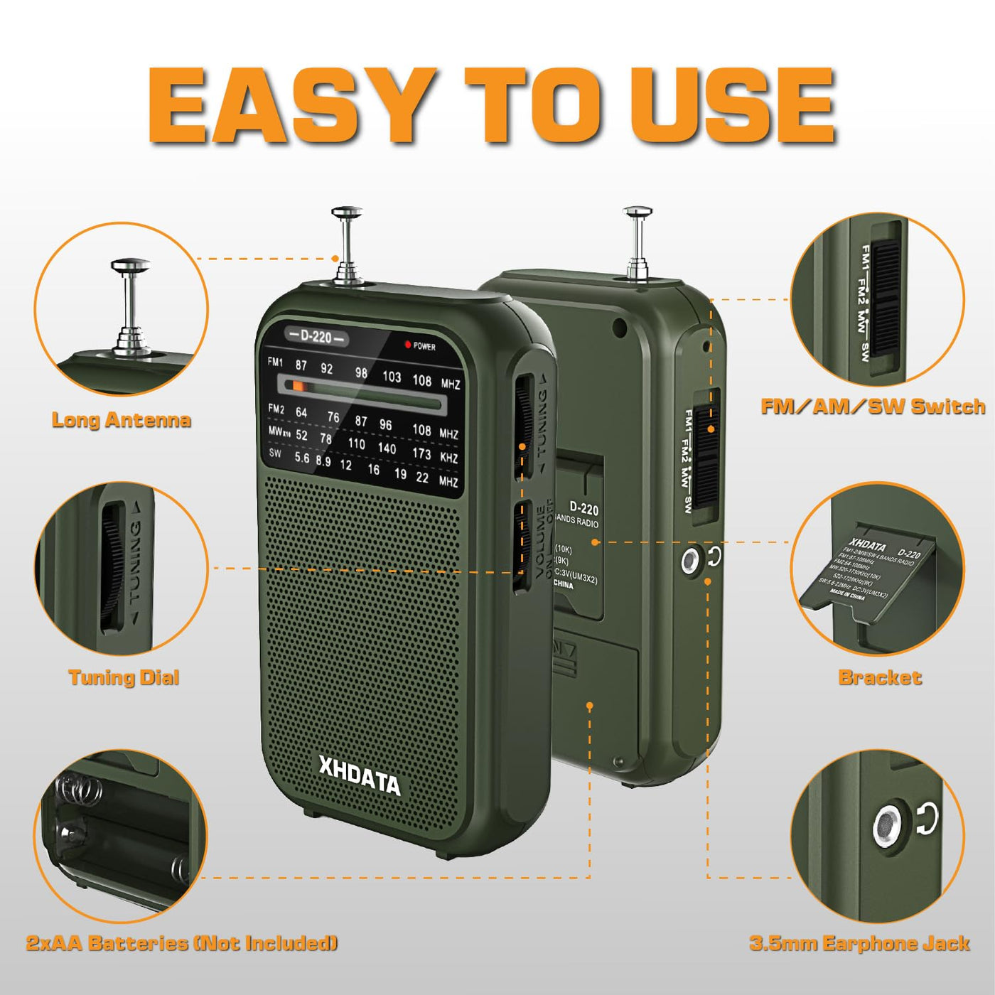 Xhdata D220 Portable Radio Am Fm Sw Radio Battery Operated Radio, Shortwave Radio With Headphone Jack, Excellent Reception Trans