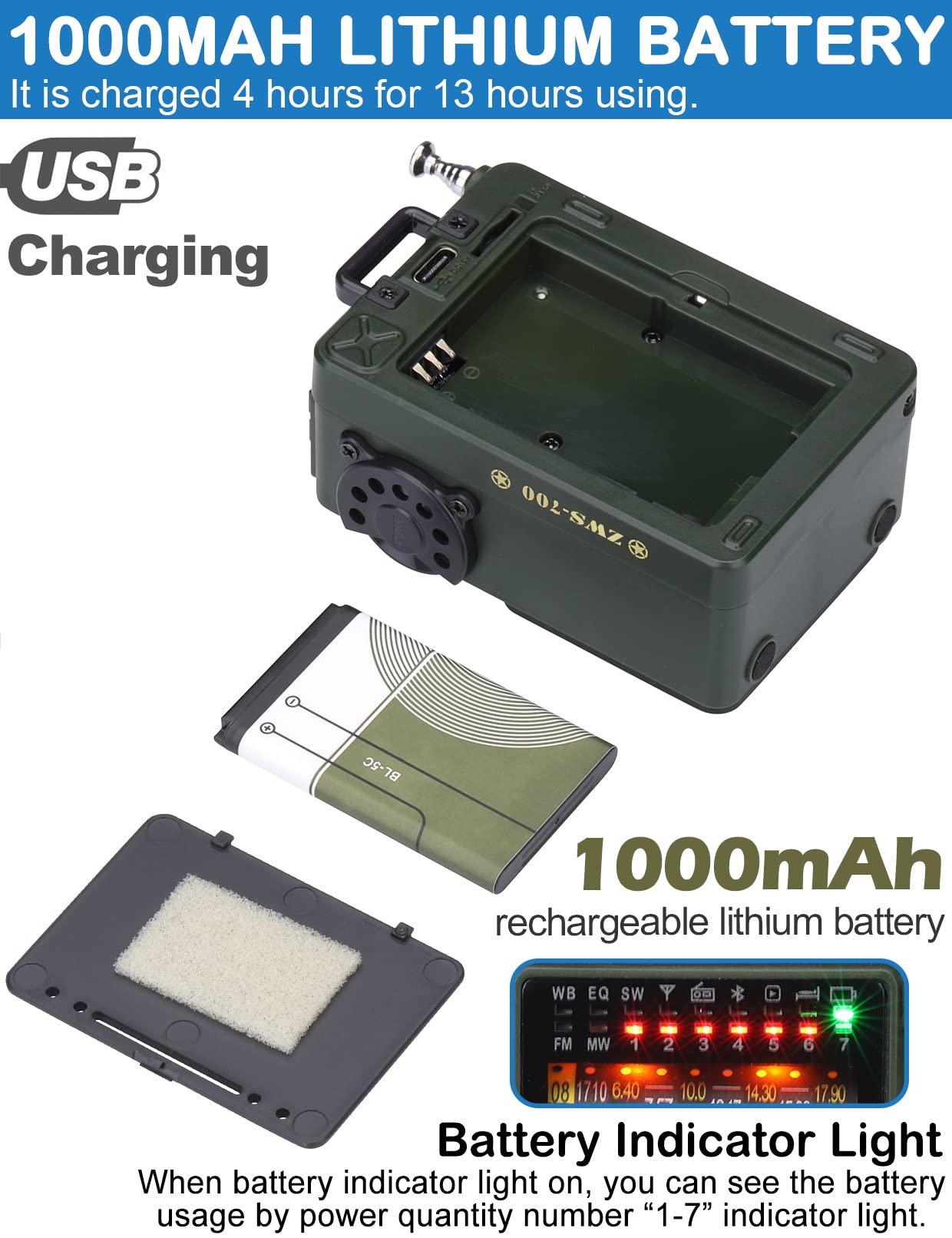 Zhiwhis Zws-700 Shortwave Radio: Cool &Amp; Portable:&Nbsp; Nature-Inspired Speaker To Highlight Mens Love Of The Outdoors And Adventures With A&Nbsp;Military-Stylel Design And Military-Grade Quality. The Handy Size Of 3.5*2.1*1.5 Inch And Weight Of 300G Make It Easier To Carry. Perfect For Hiking, Camping, Party, And Travel, Etc. Small In Size, But Big In Sound:&Nbsp; The Extremely Loud And Crisp Sound Through A High-Performance Driver And A Unique Enhanced Bass Brings You The Best Music Sound. Just Bring The Epic Music Wherever You Go! Compared To Those Traditional Bulky Speakers, Zws-700&Nbsp;Weighs Only 0.3Kg And Is Wireless,&Nbsp; Which Could Be Easily Carried Around When You Are Chilling At Home, Taking A Shower, Attending A Party, Working Out Or During Road Trips. With Bluetooth 5.0, Zws-700 Can Stream Music Smoothly From Your Phone, Tablet, Laptop Or Any Other Devices.&Nbsp; Specifications: Fm: 87-108 Mhz, Mw:&Nbsp; 520-1710Khz(10K), Sw: 5.70-17.90 Mhz, Wb: 162.40-162.55 Mhz Power: 1000Mah Bl-5C Lithium Battery (Included) Charging: Dc 5V, Usb Type-C Interface Fm Antenna: 280Mm/11 Inches Am Antenna: Internal Am Ferrite Bar Antenna Dimensions: 53*37*88Mm/ 3.5X2.1X1.5 Inch Weight: 130G/0.29Lb Bluetooth Edition: Ver 5.0 Support: Microsd/Tf Card, Up To 256Gb Audio Format: Mp3, Wav, Wma Built-In Speaker: F40Mm/4O/3W Widely Used: For For Camping, Hurricane, Home, Traveling, Camping, Hiking, Walking, Mowing, Fishing, Bicycle, Etc. Hope This Portable Product Bring Joy To Your Life. This Product Is Covered Under After-Sales For A Period Of 12 Months From The Date Of Retail Purchase.&Nbsp; This Product Had Been Strictly Inspected Before Leaving The Factory.