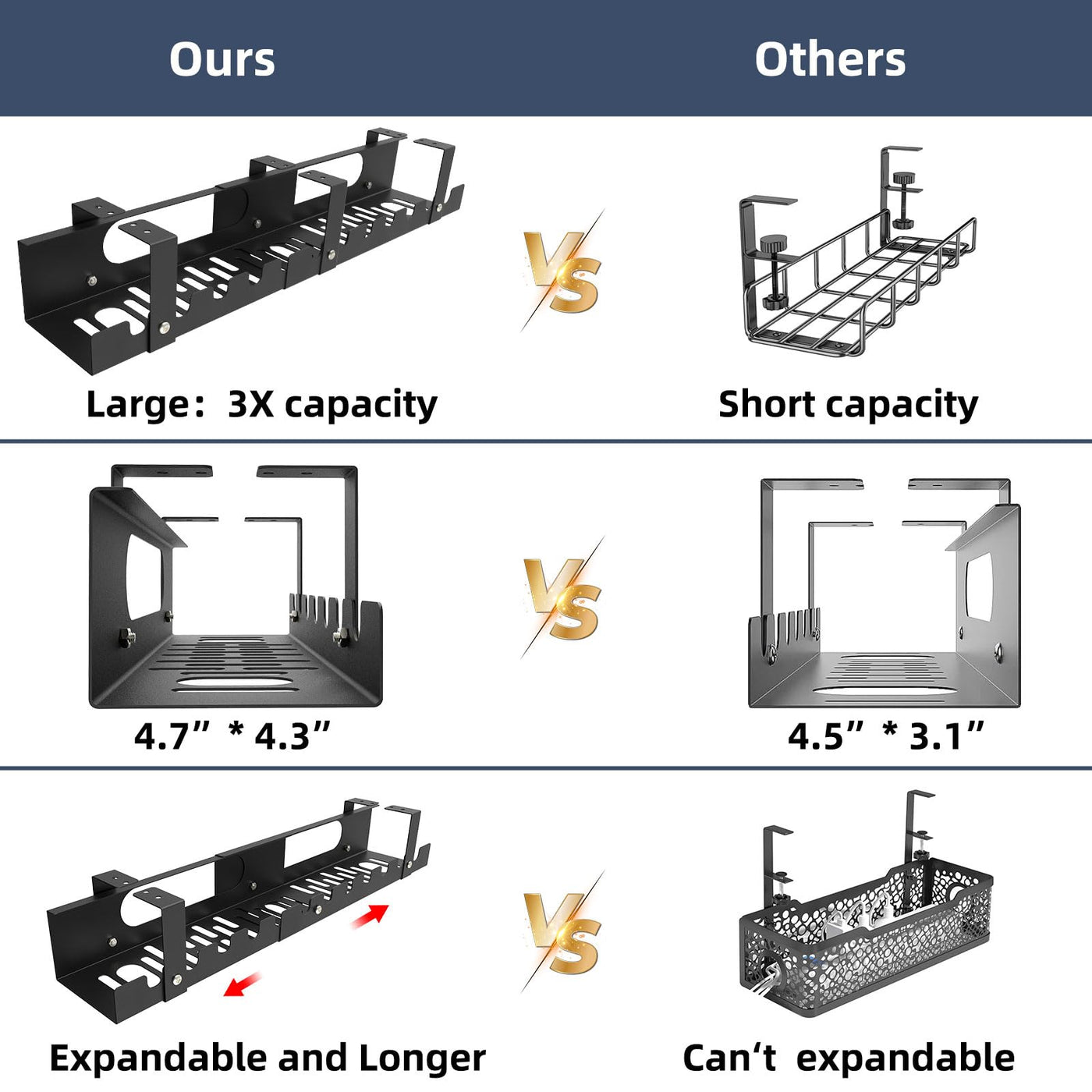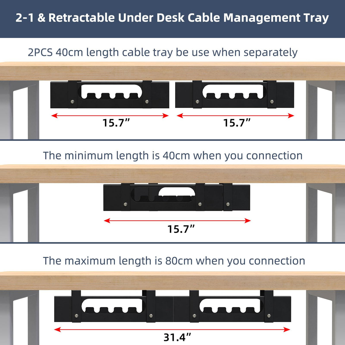 Applicaton : Upgraded Adjustable Large Under Desk Cable Management Rack Can Help You Get Everything Hidden Neatly And Make Your Home Office Work Space More Organized. Create Additional Storage Space,Ideal For Keeping A Work Desk, Home Office Desk, Or Gaming Desk Neat And Organized, So That You Can Get The Cords And Power Strips Off The Floor Perfectly ! Feature - 2-In-1 Adjustable Length Cable Management Tray : Under Office Desk Cable Management Multiple Holes Are Reserved On The Side Of The Cable Tray, Which Can Be Connected And The Length Can Be Adjusted. When You Need To Connect,The Minimum Usable Length After Coonection Is 15.7''(40Cm);The Maximum Usable Length After Coonection Is 31.4''(80Cm). When You Don'T Need To Connect, You Can Use One Or Two Desk Cable Organizers, Each With A Length Of 15.7 (40Cm). The Under Management Tray Can Be Freely Retracted According To The Length Of The Table. -Super Sturdy : Our Cable Management Trays Is Made Of High Quality 2Mm Steelwith A Good Black Finish.The Desk Cable Management Tray Can Hold Up To 23 Lb, The Surface Is Treated With Matte Paint,And Is Not Easy To Rust. -Open Design For Airflow : The Hollow Design At The Bottom Maximizes Air Flow, Avoids Safety Hazards Caused By Overheating, And Protects Your Working Environment. -Installation:The Under Desk Wire Cable Organizer Install Easily And Allow You Great Flexibility In Arranging The Wires To Makes For A Controlled And Neat Arrangement.