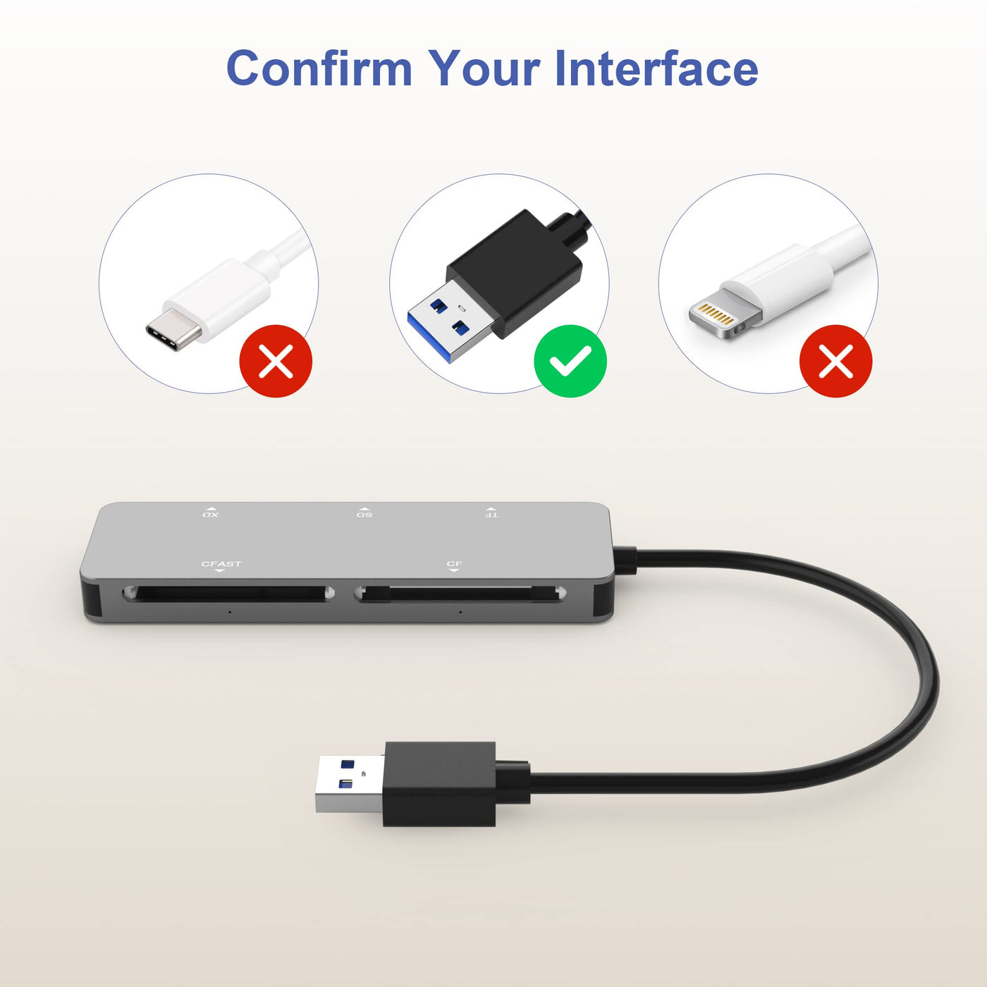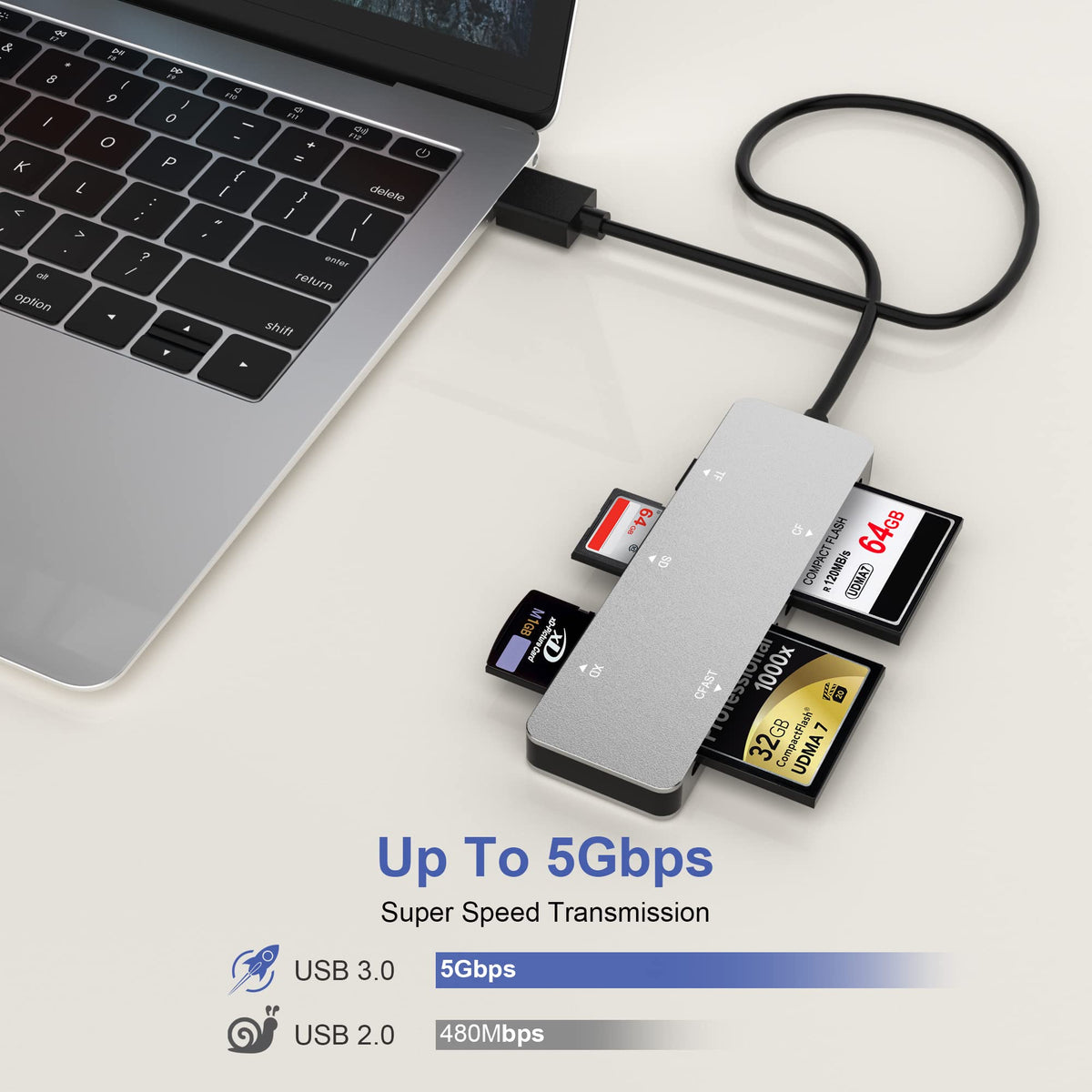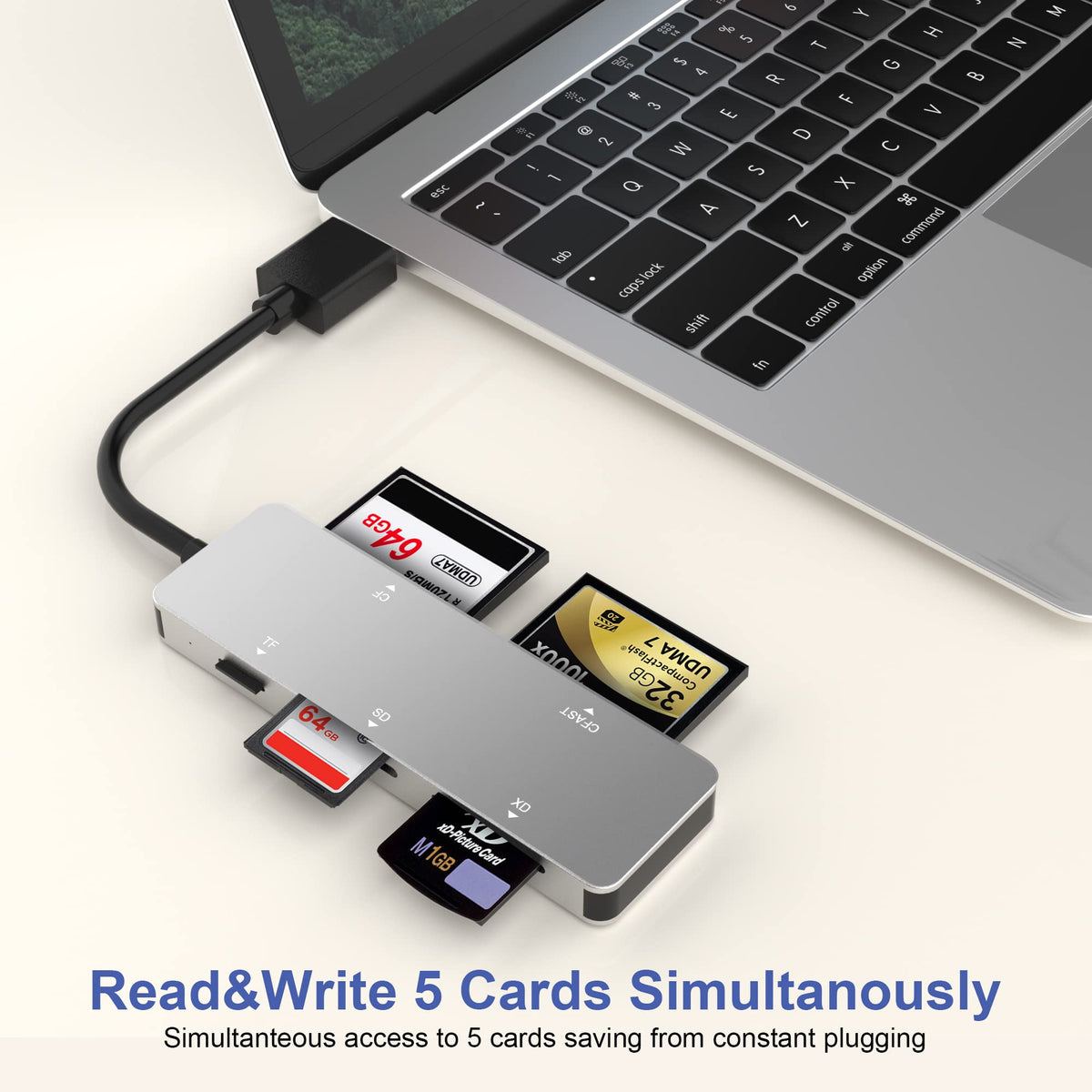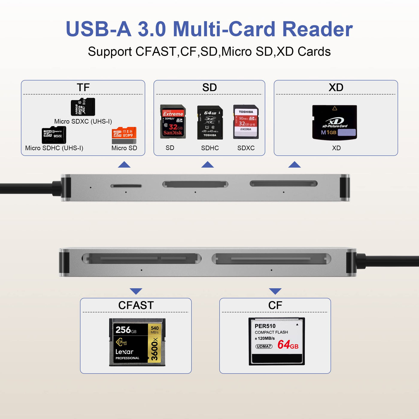 Usb A 3.0 Cfast Xd Cf Sd Tf 5-In-1 Card Readerhigh Speed Transmissionthe Speed Of 5 In 1 Usb 3.0 Card Reader Up To 5.0Gbps Data Sync. (10 Times Faster Than Usb2.0 Speed)One Reader For Multi Cardssimultaneously Read And Write On Cfast Xd Cf Sd Tf Five Cards, Eliminating The Effort Of Plugging In And Out.&Nbsp;Great Compatibilitycfast Card Slot:Cfast 2.0 Memory Cards, Including Pixelflash, Lexar, Transcend, Sandisk, And Sony.Xd Card Slot:Olympus And Fuji Xd Picture Card 1Gb 2Gb&Nbsp;Cf Card Slot:Cf Cardtf Card Solt:Micro Sd, Micro Sdhc, Micro Sdxc, Tf Cardsd Card Slot:Sdhc, Sd Card, Rs-Mmc, Mmc Micro Cardplug &Amp; Play And Hot-Swapping Capabilityaluminum Compact Designthis Cfast Xd Cf Sd Tf 5-In-1 Card Reader With A Compact Portable Design Could Save Space And Easy Take.With A Slim And Sleek Design, Aluminum Material, Easy To Carry And A Great Kit For Travel.Package Include:1 X Cfast Xd Cf Sd Tf 5-In-1 Card Reader1 X User Manual24-Year Warranty