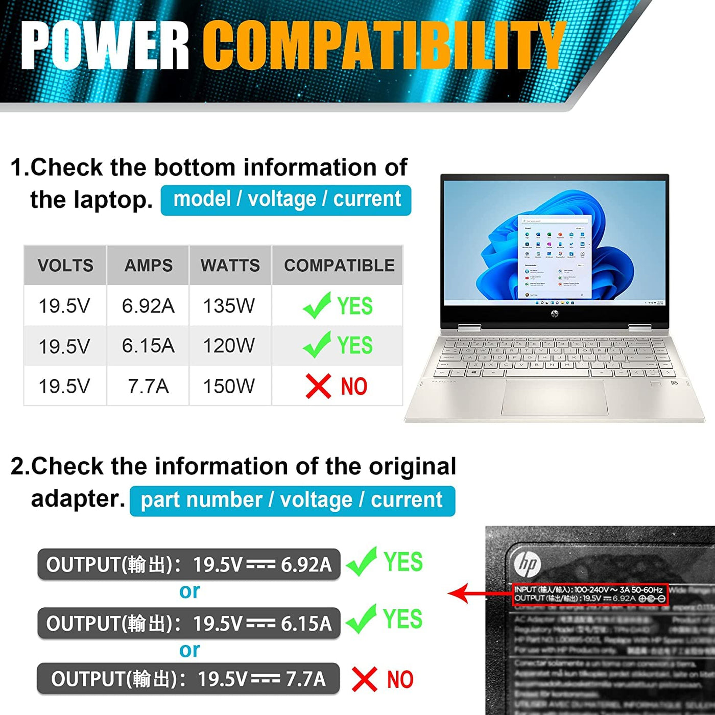 Hp 135W Laptop Chargerproduct Descriptioninput: 100-240V,50-60Hz.Output:19.5V 6.9A Connector Size: 4.5*3.0Mm Blue Tip (Not Compatible With 7.4*5.0Mm Black Tip)19.5V 6.92A 135W Please Check Your Laptop Specifications Before Buy It.135W Hp Charger Power Cord Compatible With:Hp Spectre 15-Df X360 Convertible Pchp Pavilion Gaming 17 15 Seriesomen By Hp 17 15 Serieshp Zbook Create G7 Notebook Pc Hp Zbook Studio G7 Mobile Workstation.Compatible P/N: Hp L15534-001 Tpn-Da11 Tpn-Da11 Tpn-Ca13