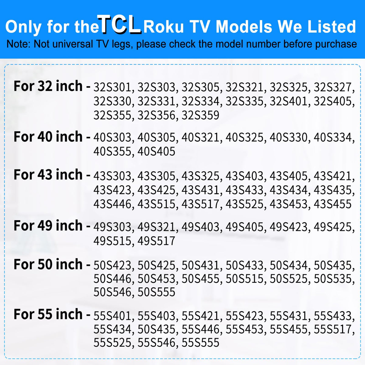 The Tv Feet Compatible With Tcl Tv Above 40 Inch 40In - 40S325, 40S303, 40S330, 40S334, 40Fd2700 43In - 43S303, 43S305, 43S403, 43S421, 43S431, 43S433, 43S434, 43S435, 43S435-B, 43S525, 43Rp620K 49In - 49S425, 49S405, 49S403, 49S325, 49S303, 49S515, 49S517, 49S305, 49S405 50In - 50S421, 50S423, 50S425, 50S435, 50S535 55In - 55S421, 55S423, 55S425, 55S434, 55S435, 55S531, 55S535, 55R615, 55R613, 55R635, 55R625, 55R617 How To Assemble 1. Lay The Tv Flat On The Table Or Desk Where It Is Stable And Balanced 2. Match The Tv Stands (Screw Holes) With The Bottom Of The Tv (The Part That Connect With The Tv Stands), Put The Screws To Connects With The Tv Stand Base Replacement And The Tv, Screw Them Tight 3. Place The Tv Well After Installing The Tv Stands Well