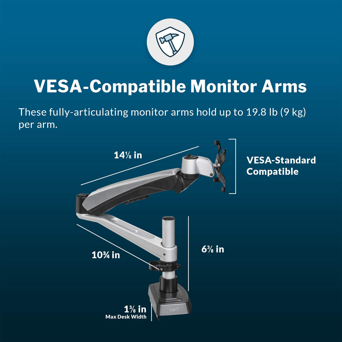Vari Dual Monitor Arm Is A Stylish And Versatile Solution For Workstations Needing To Support Two Monitors. It Provides A Secure And Precision-Flexible Way To Attach Two Monitors To Your Desk. Our Dual Monitor Arm Is Designed To Fit Most Vesa 75X75Mm Or 100X100Mm Mounting Patterns, And It Can Be Used In Any Setup. You Can Easily Attach It To Any Desk, Table, Or Flat Surface. Having Monitor Arms Is A Great Way To Add Space And Keep Things Organized! Raise Your Monitors To A Comfortable Viewing Height While Freeing Up Desk Space Beneath. The Double Monitor Arm Allows You To Raise The Screen To 12'' Off The Desk Surface, Tilt, Swivel, And Shift The Double Monitor Mount With A Dual Clamping Design To A Comfortable Position. Optimize Your Workspace And May Improve Posture And Productivity By Allowing You To Work Better Ergonomically. Made Of Premium Materials And Tested To Withstand The Dual Monitor Stand'S 360 Rotating Arms Support Up To 27-Inch Monitors Weighing Up To 19.8 Lb (9 Kg) Each, With A Quick And Easy Setup Process.