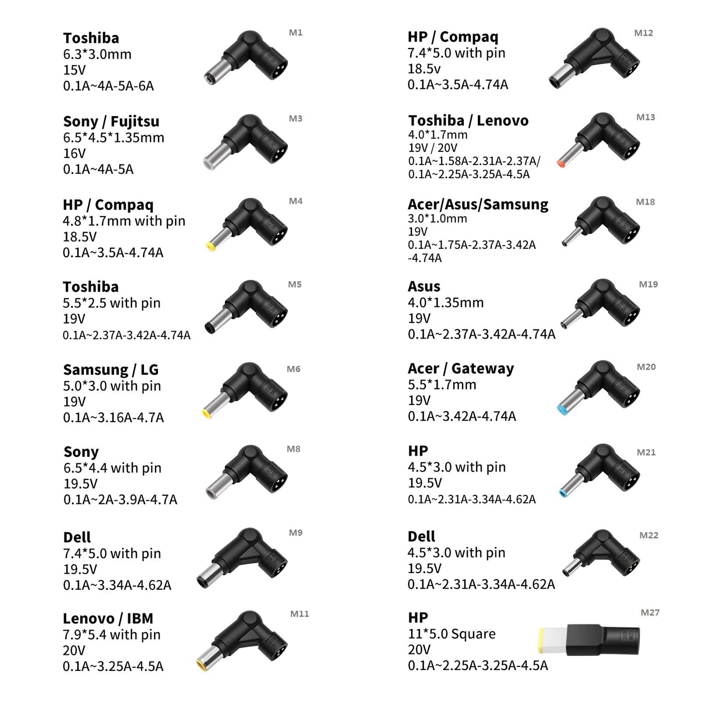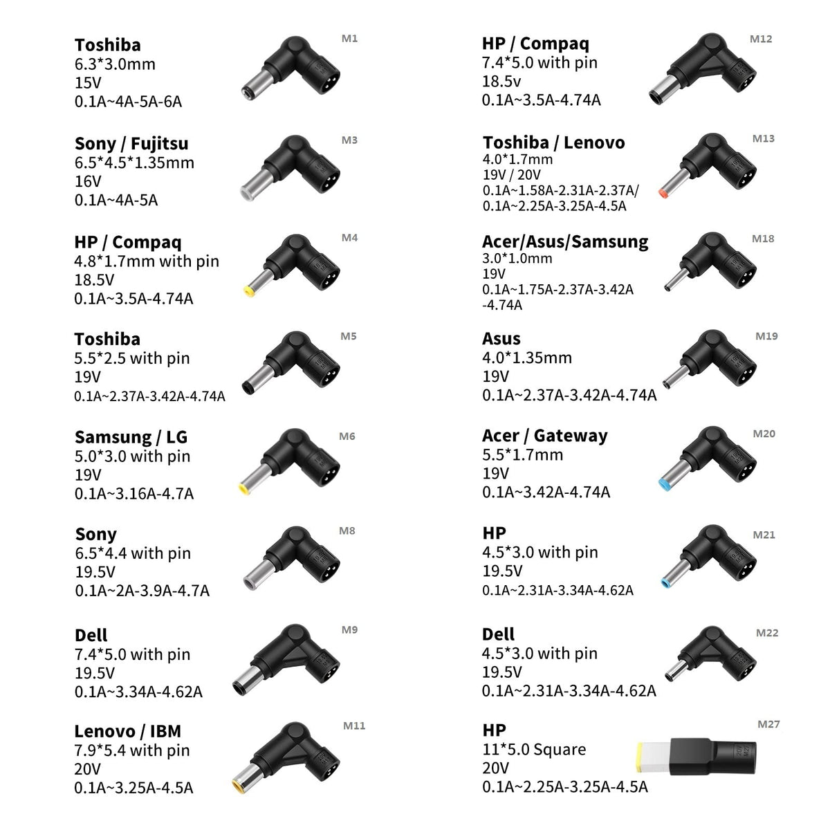 Tips Size And Fit Laptop Models M1: 15V, Dimension: 6.3*3.0Mm For Toshiba Compatible Model Laptops M3: 16V, Dimension: 6.5*4.5*1.35Mm For Sony;Fujitsu Compatible Model Laptops M4: 18.5V, 3.5A, 4.9A; Dimension: 4.8*1.7Mm.For Hp Compatible Model Laptops M5:19V, 2.37A, 3.42A; Dimension: 5.5*2.5Mm. For Toshiba Asus Compatible Model Laptops M6:19V, 3.16A; Dimension: 5.0*3.0Mm With Pin. For Samsung Compatible Model Laptops M8:19.5V, 2A, 3.9A;Dimension: 6.5*4.4Mm With Pin. For Sony Compatible Model Laptops M9:19.5V, 3.34A; Dimension: 7.4*5.0Mm With Pin. For Dell Compatible Model Laptops M11:20V, 3.25A; Dimension: 7.9*5.4Mm With Pin. For Lenovo/Ibm Compatible Model Laptops M12:18.5V, 3.5A; Dimension: 7.4*5.0Mm With Pin. For Hp Compatible Model Laptops M13: 19V,1.58A, 2.31A, 2.37A ; Dimension: 4.0*1.7Mm. For Toshiba Compatible Laptops M18:19V, 2.1A, 2.37A, 3.42A; Dimension: 3.0*1.0Mm, For Acer/Samsung/Asus Compatible Laptops M19:19V, 2.37A, 3.42A; Dimension: 4.0*1.35Mm.For Asus Compatible Model Laptops M20:19V, 3.42A; Dimension: 5.5*1.7Mm.For Acer Gateway Compatible Model Laptops M21:19.5V, 2.31A, 3.33A; Dimension: 4.5*3.0Mm With Pin. For Hp Compatible Model Laptops M22:19.5V, 2.31A, 3.34A; Dimension: 4.5*3.0Mm With Pin.For Dell Compatible Model Laptops M27:20V 3.25A; Dimension:11*5.0Mm Square. Compatible: For Lenovo Compatible Model Laptops