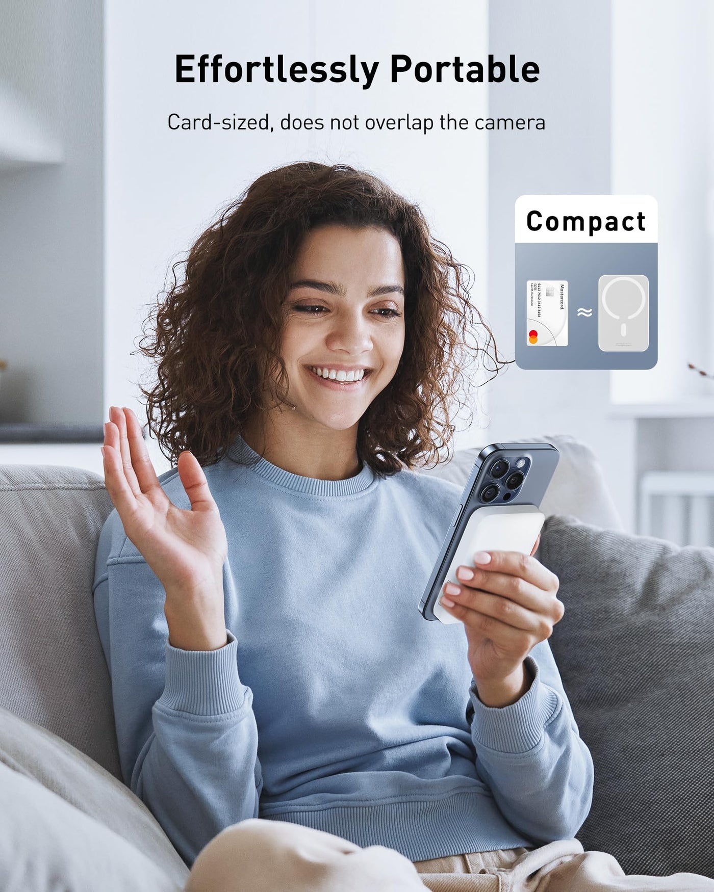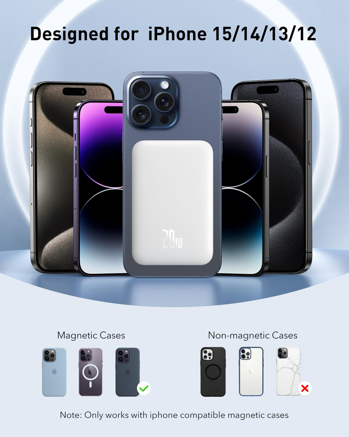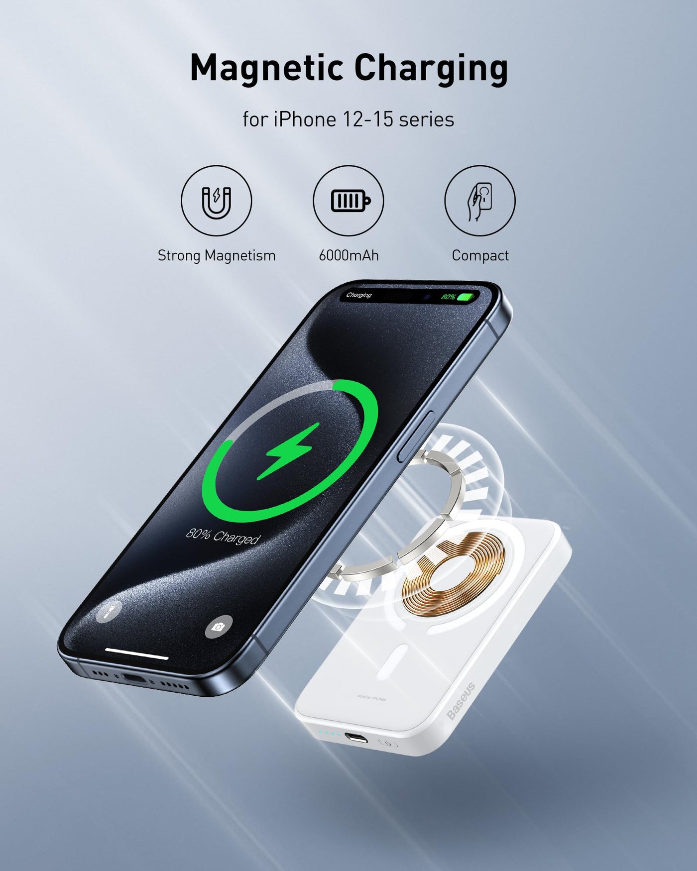 Baseus Magnetic Power Bank, Mini 6000Mah Compatible-Magsafe Battery Pack Pd 20W Wireless Portable Charger, For Iphone 15/15 Plus/15 Pro/15 Pro Max, Iphone 14/13/12 Series. Compatibility: Iphone 15/15 Pro/15 Pro Max,Iphone 14, Iphone 14 Plus, Iphone 14 Pro, Iphone 14 Pro Max, Iphone 13, Iphone 13 Pro, Iphone 13 Pro Max, Iphone 13 Mini, Iphone 12, Iphone 12 Pro, Iphone 12 Pro Max, Iphone 12 Mini Not Compatible With Non-Magsafe/Non-Magnetic Phone Case. (It Causes Weak Or No Magnetism.) Other Phones/Devices That Support Wireless Charging Can Be Charged Wirelessly, But Have No Magnetic Function. We Recommend Charging With A Magsafe Phone Case Or Without Cases To Get Enough Suction. For Example: Iphone Se 2Nd(2020) / Iphone Se 3Rd(2022) / Iphone 8 / Iphone 8 Plus / Iphone X / Iphone Xs / Iphone Xs Max / Iphone Xr / Iphone 11 / Iphone 11 Pro / Iphone 11 Pro Max / Samsung Glaxy Series Etc.