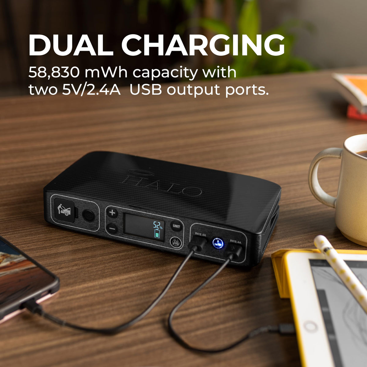 Q: What is the capacity of the Halo Bolt Air portable power kit?A: The Halo Bolt Air has a capacity of 58830 mWh, making it a reliable source of portable power for charging devices and jump-starting vehicles.