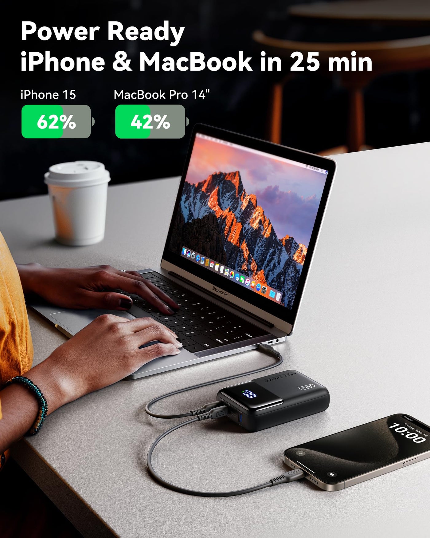 Q: How fast can the INIU Power Bank charge my devices?A: This power bank offers high-speed charging with up to 110W output, allowing you to charge two devices simultaneously. For example, it can charge a MacBook Pro 14" to 42% in just 25 minutes and an iPhone 15 to 62% in the same time frame.