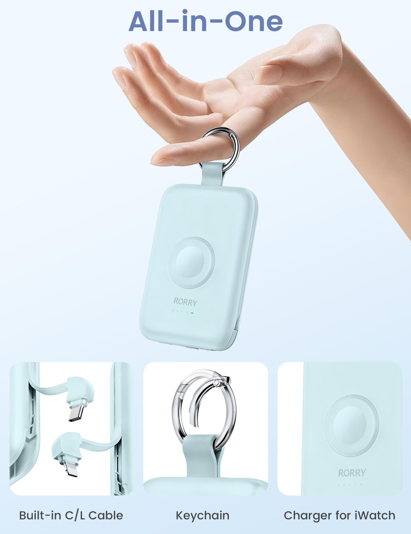 Q: What devices are compatible with the RORRY Portable Charger?A: The RORRY Portable Charger is widely compatible with various Apple devices, including the iPhone 16/15/14/13/12/11/XS/XR/SE Pro/Pro Max and Apple Watch Ultra/9/8/7/6/SE/5/4/3/2. It also works with AirPods and other USB-C devices.