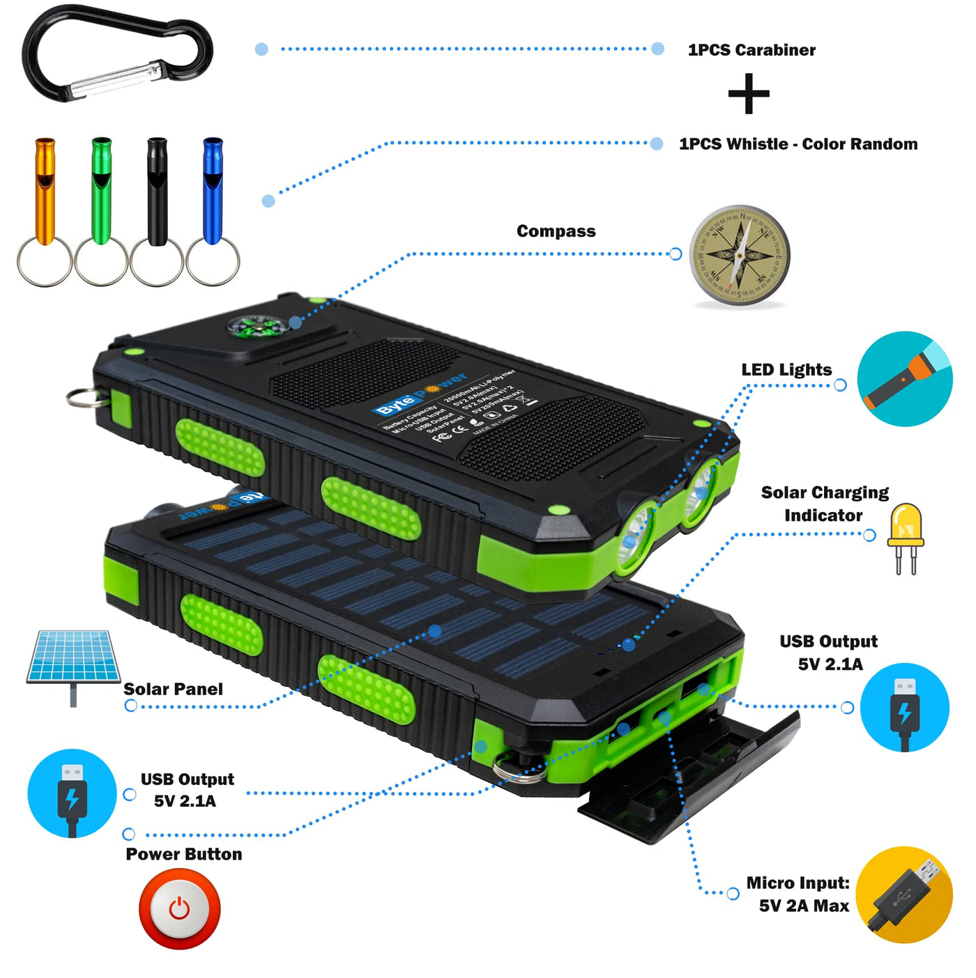 Solar Charger Power Bank 20000Mah, Portable Solar Pone Charger With Compass,Carabiner, Whistle,Flashlights,Solar Panel Charger,Camping Gear Accessory (Green)