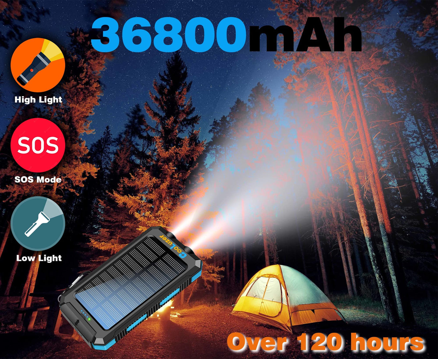 Q: What is the battery capacity and lifespan of the power bank?A: The Solar Charger Power Bank has a massive capacity of 36800mAh, powered by a Grade A+++ Lithium polymer battery. It is designed for durability with a lifespan of over 3000 full charge cycles, ensuring long-term reliability.