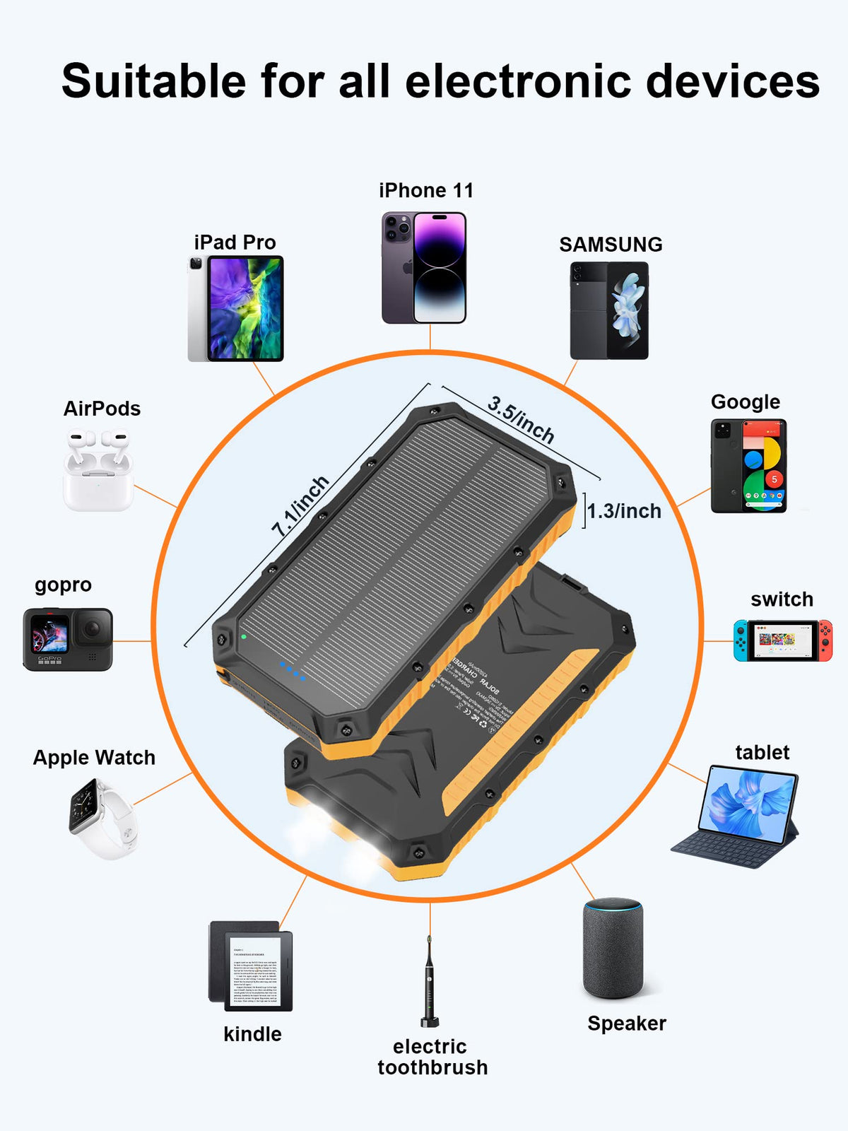 ? 42800Mah Ultra-Large Cell Capacity Portable Charger Will Keep Your Phone Running All-Day? Solar Power Bank Has Built-In 3 Outputs & 2 Inputs Ports(Usb C Input/Output, Micro Usb Input, Usb A&B Output, ), It Allows Charging 3 Devices At The Same Time. ? Solar Charger For An Outside Emergency: The Solar Panel Could Absorb Light And Transfer It Into Electricity, But It Is An Auxiliary Function That Is Only For Emergencies When You Are In Outdoor Activities.?Ip65 Waterproof, Dust-Proof, Shockproof, And Durable With Led Flashlight: Light Up Your Way In A Dark Environment? Built Reliable Lithium Polymer Battery Helps To Charge Your Phone Safely? 4 Led Indicators (25%-50%-75%-100%) Are Just The Coolest Way To Report Remaining Power?Qc 3.0 Fast Charger. Type-C Can Be Used To Finish Input And Output.? Work With Not Only All Phones And Tablets But Smaller Devices Like Your Bluetooth Headphone And Speaker, Fitness Tracker, Smartwatch, Etc;
