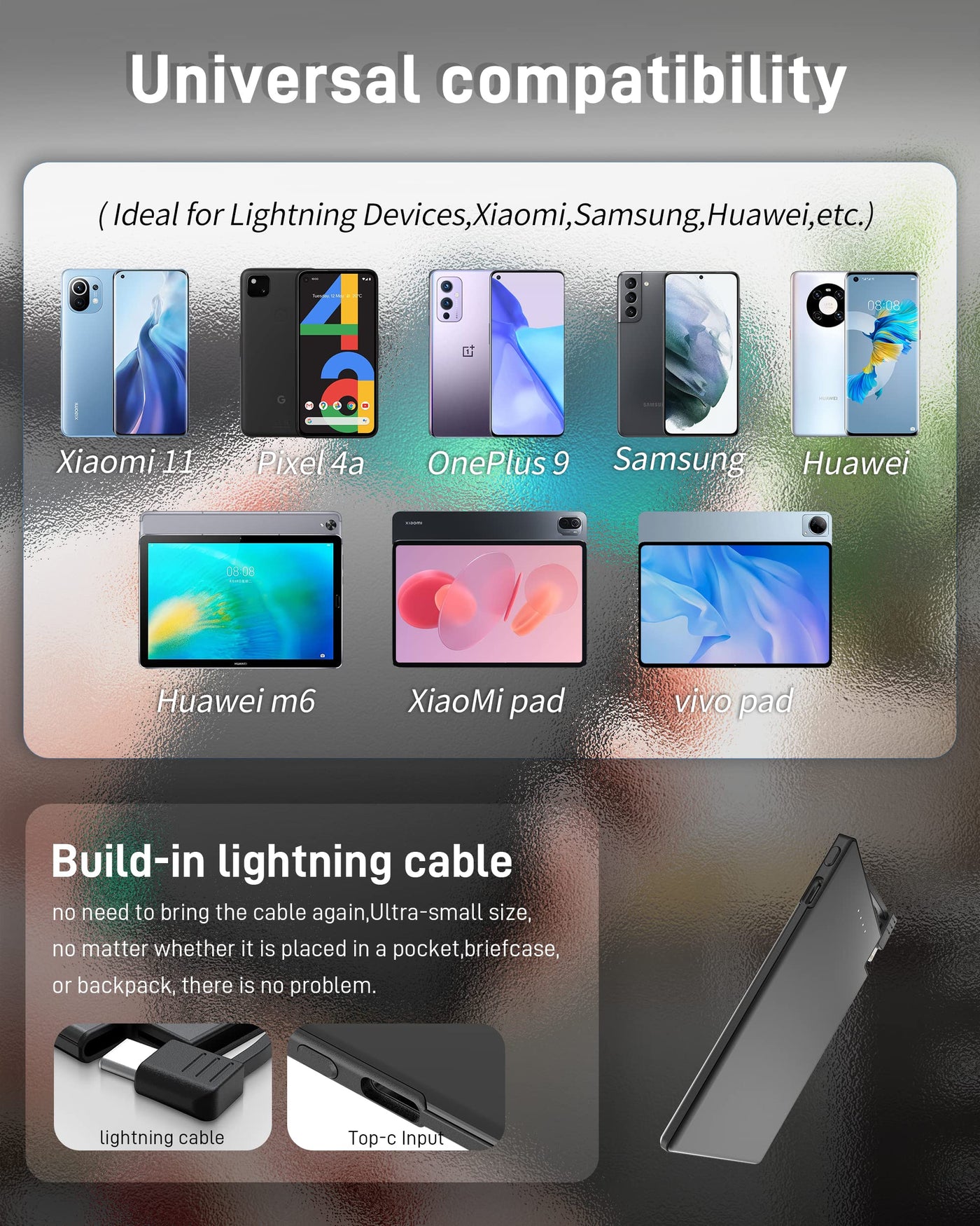 Q: How does the built-in cable work for charging my phone?A: The built-in USB-C cable allows for direct charging of USB-C compatible devices, including the iPhone 15 series. For devices that use a Lightning port, an additional Lightning cable is required, which is not included in the package.