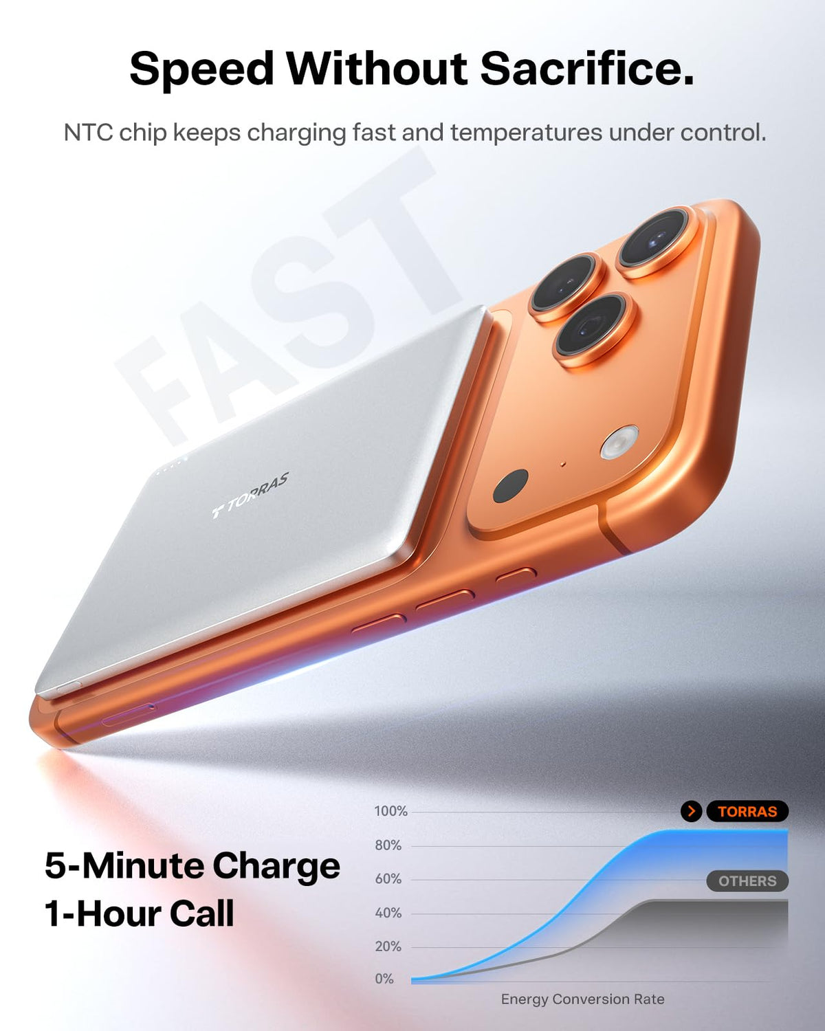 Torras Minimag 5000Mah Magnetic Charger, The Ultimate Slim And Durable Portable Power Bank. Compatible With Iphone 17 Pro Max/Iphone 16 Pro Max /Iphone 15 Pro Max / Iphone 14 Pro Max / Iphone 13 / Iphone 12, Airpods Pro 1/2/3, Samsung Galaxy S25 Ultra / S25 / S25 Plus / S24 Ultra, Ipad Pro / Mini, And More. Featuring Low-Temperature Safe Magnetic Wireless Charging, 10W Wired Charging, And A Low-Current Mode For Apple Earphones. With Its Ultra-Thin Design, It Fits Seamlessly In Your Hand And Offers A Powerful 10N Magnetic Attraction. Experience Fast, Portable, And Reliable Charging Wherever You Go.