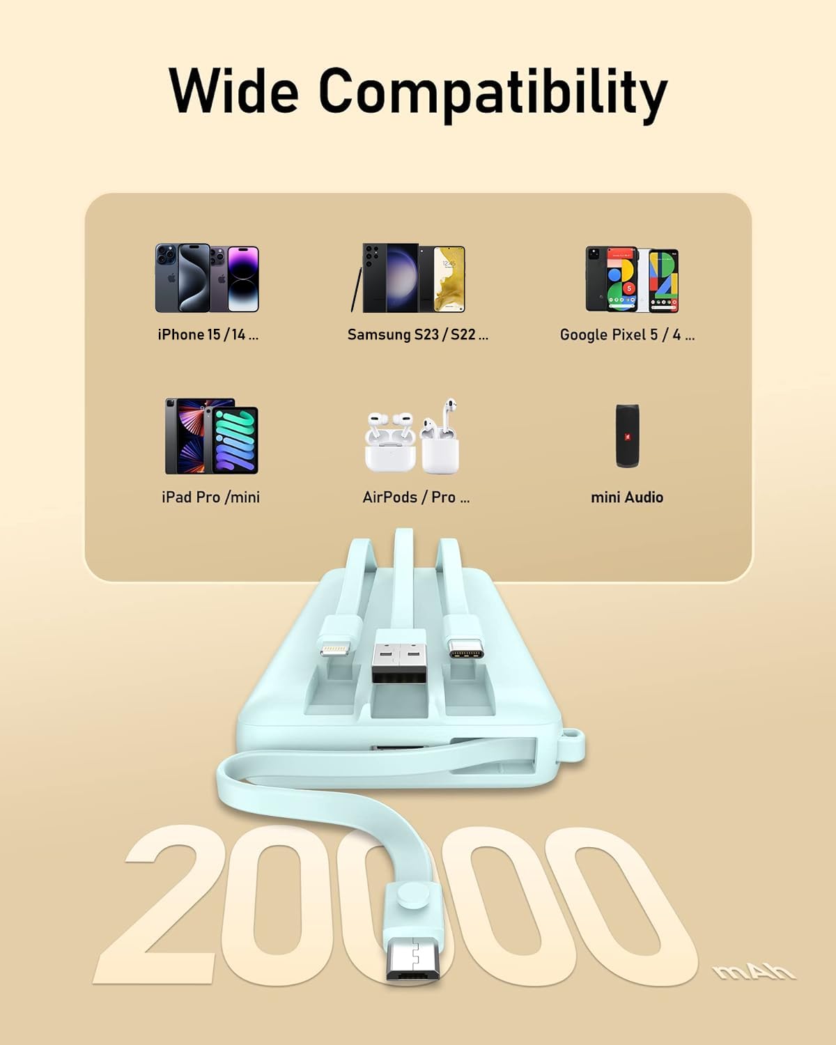 [ Portable Charger Built In Cables ] This Built In Cables Portable Charger Power Bank Features Built-In Iphone, Usb-C, And Usb-Micro Cables, Making It A One-Stop Solution. This Portable Charger Power Bank Is Universally Compatible With Popular Smart Devices, Including The Iphone 16/15/14/13/12/11/8/7 Series, Xr, Xs Max, Samsung Galaxy S24/S23/S22/S21/S10/S9/S8/Galaxy Z Flip/Z Fold/Galaxy A51/52/53/54/55/Note 20/10, Google Pixel Series, And Many More Smartphones And Usb-C Devices | [ Powerbank Fast Charging ] This Fast Charging Power Bank Is Equipped With Both A Usb-C Output Cable And Port, And Supports Quick Charge Output. This Portable Charger For Iphone Charges Your Iphone 15 Twice As Fast As Other Regular Chargers | [ Portable Battery With Dual Usb Recharging ] This Portable Charger Usb C Offers Two Recharging Methods: You Can Conveniently Charge The Battery Pack By Plugging The Built-In Usb Cable Into A Usb Base, Or By Inserting An Additional Usb-C Charging Cable Into The Usb-C Port On The Battery Bank | [ Travel-Friendly Essentials ] High Capacity And Poweful, This Energy-Packed Battery Bank Includes An Adjustable Strap Cable For Easy Carrying. Hang It On Your Handbag Or Backpack To Free Up Your Hands. With 20000Mah Capacity, It'S A Travel Essential Providing Backup Power For Your Smart Devices | [ Airline Approved & Absolute Safety ] This Power Bank For Iphone Is Certified By Ul 2056, Ce, Rohs, Iec 62133, Fcc, And Complies With Aviation Safety Standards. The Portable Battery Equipped With Intelligent Protection Measures And Advanced Fire-Resistant Materials, It Guards Against Issues Such As Overcurrent, Overvoltage Protection, Overheating, And Overcharging. Safety Is Always Our Top Priority | [ Intelligent Led Display] The Intelligent Led Battery Level Indicator Of The Battery Pack Charger Portable Shows You The Remaining Battery Level And Charging Status, Ensuring You'Re Always Aware Of Your Power Bank'S Status At A Glance.[ What You Get ] 20000Mah Portable Power Bank Usb C X 1, Usb C Cable X 1, User Manual X 1