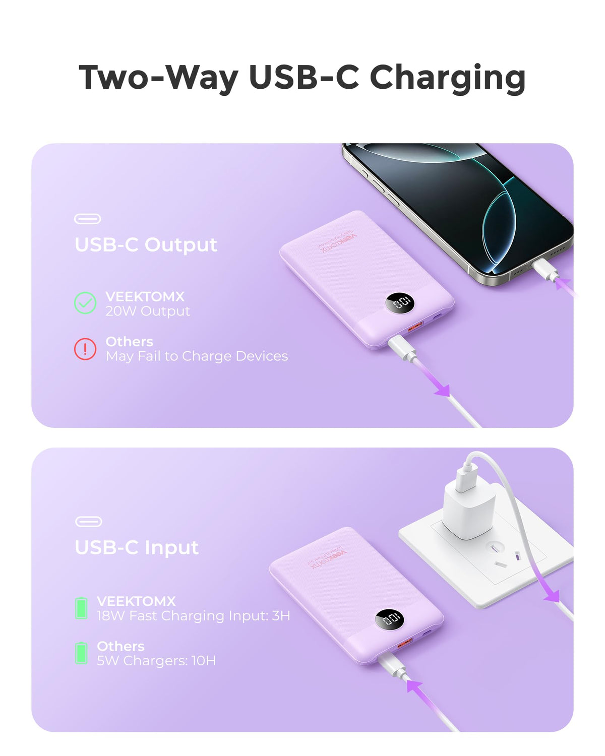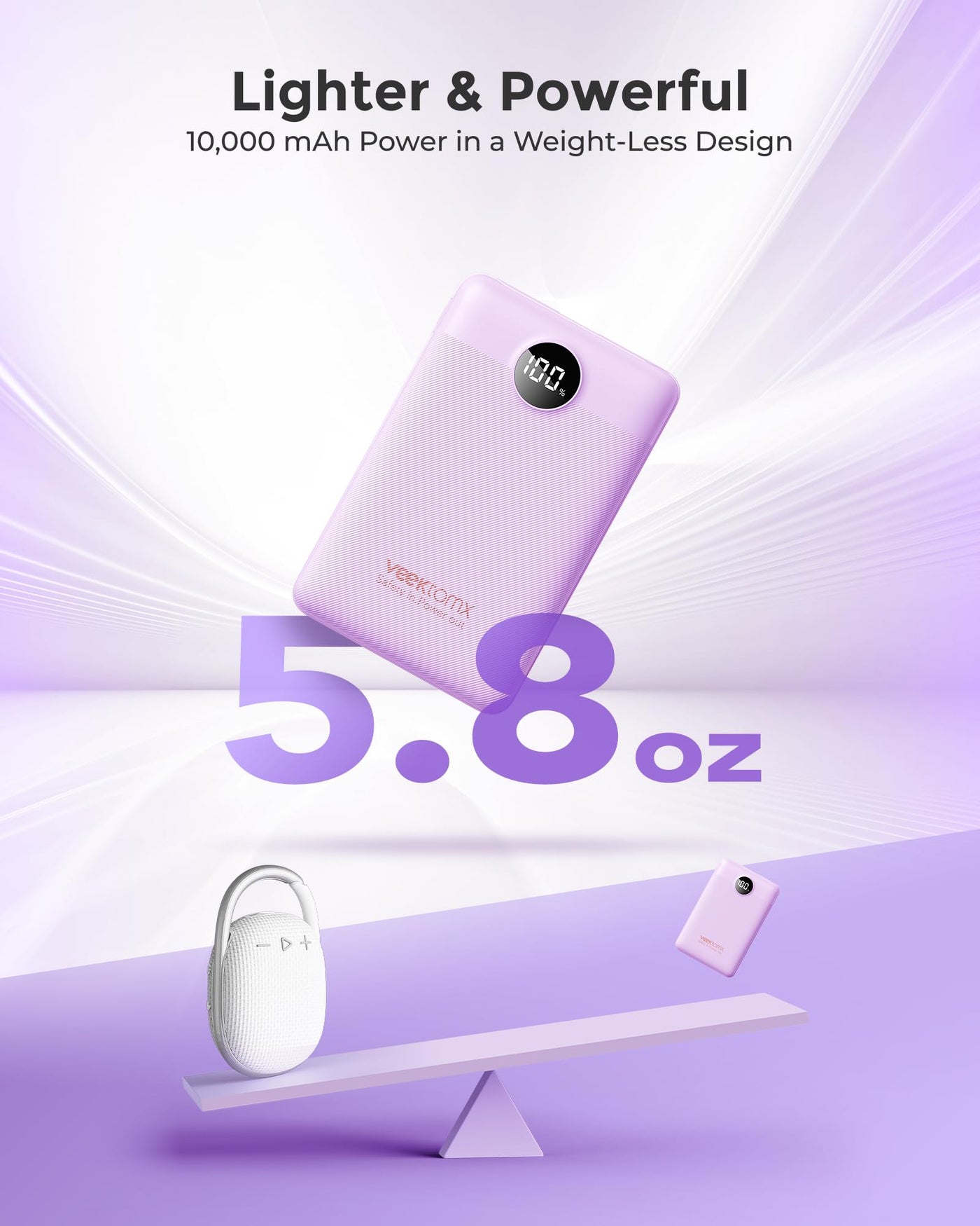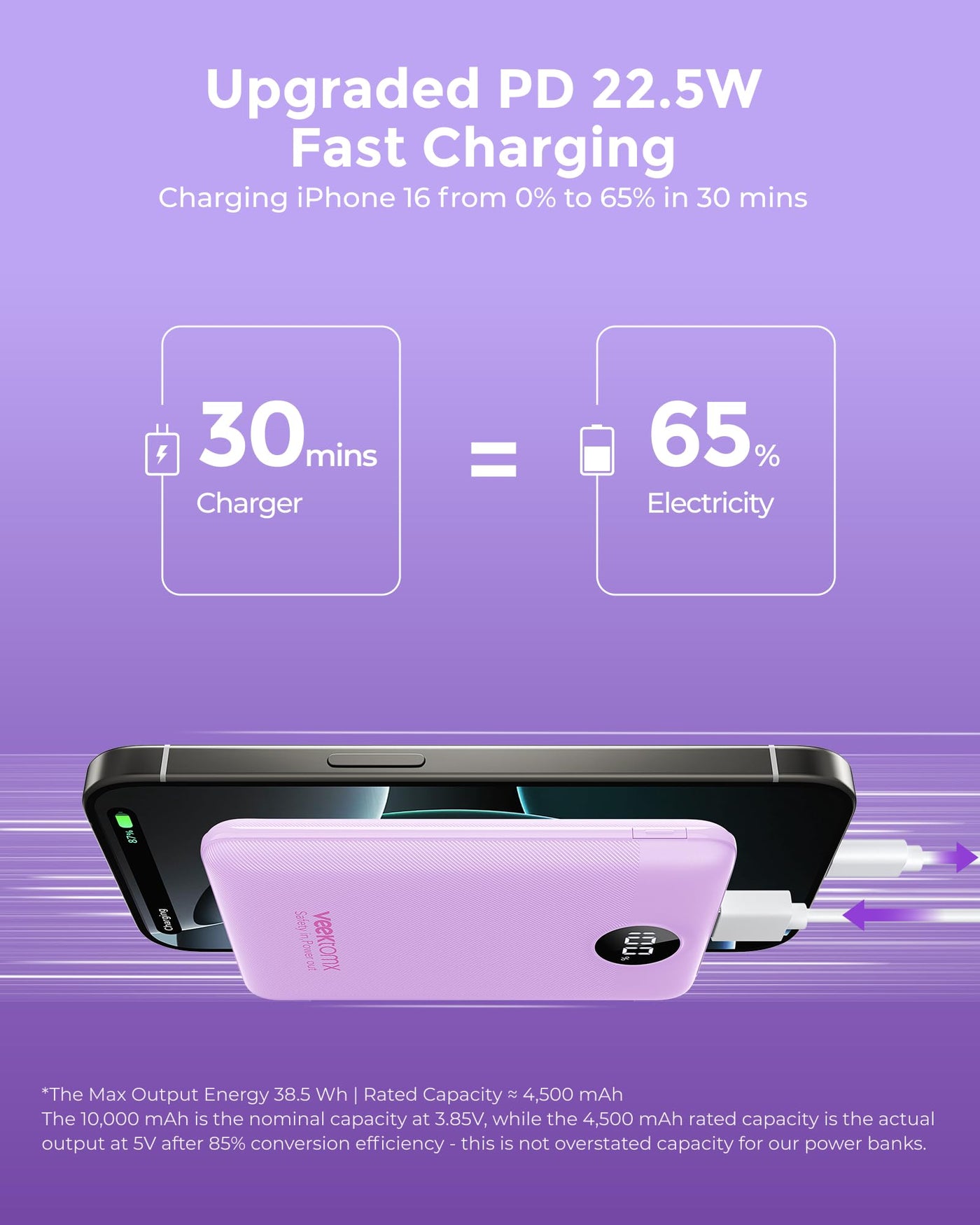 Veektomx Small Portable Charger, Mini Power Bank 10000Mah, Pd 22.5W Fast Charging Usb-C Battery Bank, Travel Essentials Dual Voltage External Portable Powerbank For Iphone/Samsung/Google Pixel, Purple