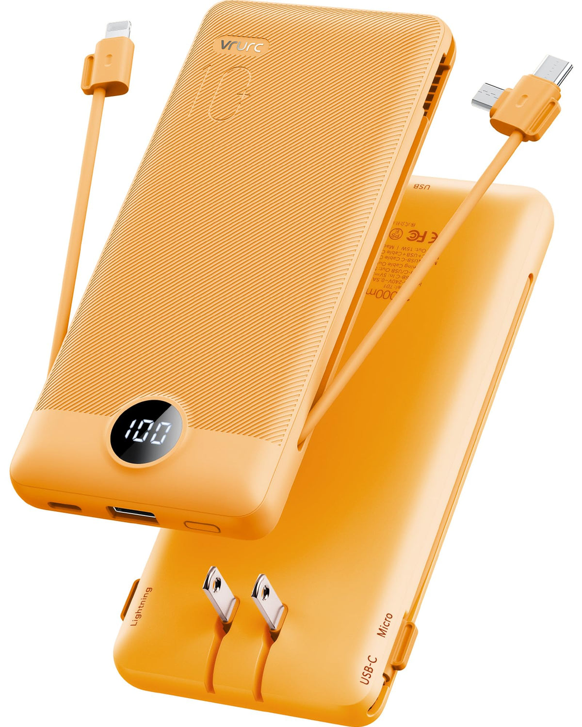 Portable Charger Built-In Cables And Ac Wall Plug, Vrurc Usb C Power Bank 10000Mah, Travel Battery Phone Charger Compact Lightweight External Battery Pack For Smart Phones, Tablets Etc-Orange