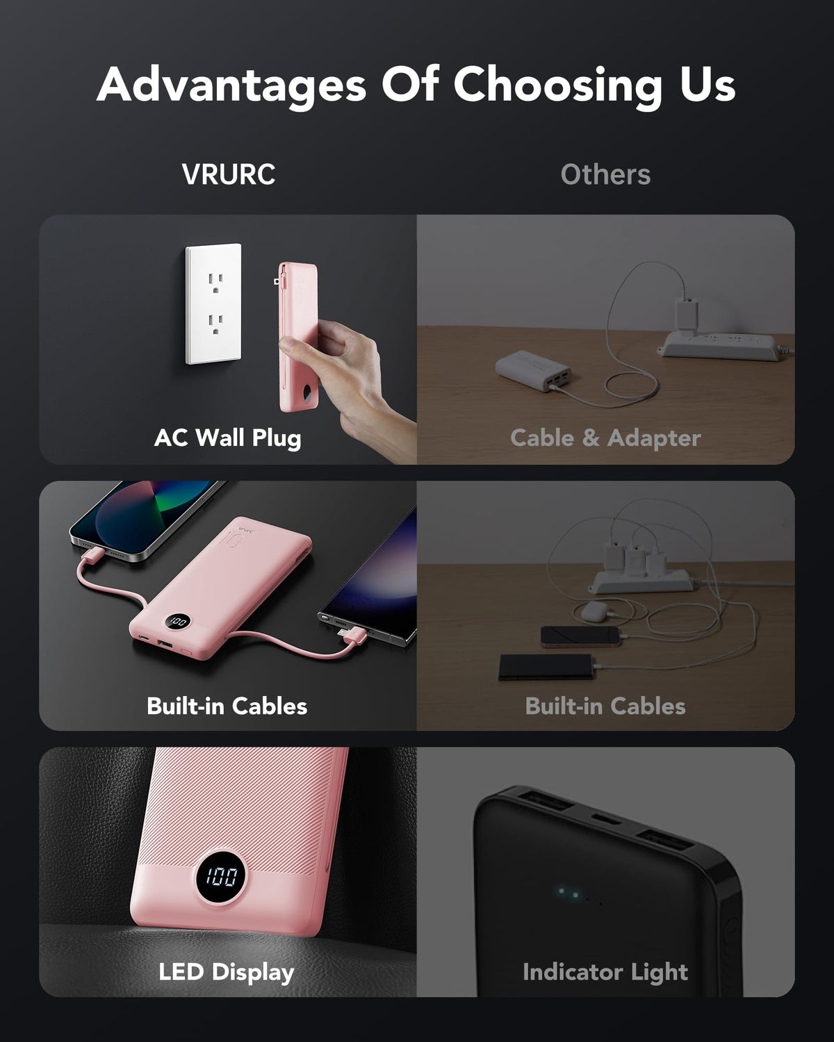 Vrurc Portable Charger Power Bank With Wall Plug, 10000Mah Portable Charger With Built In Cables, Pd 20W Fast Charging Portable
