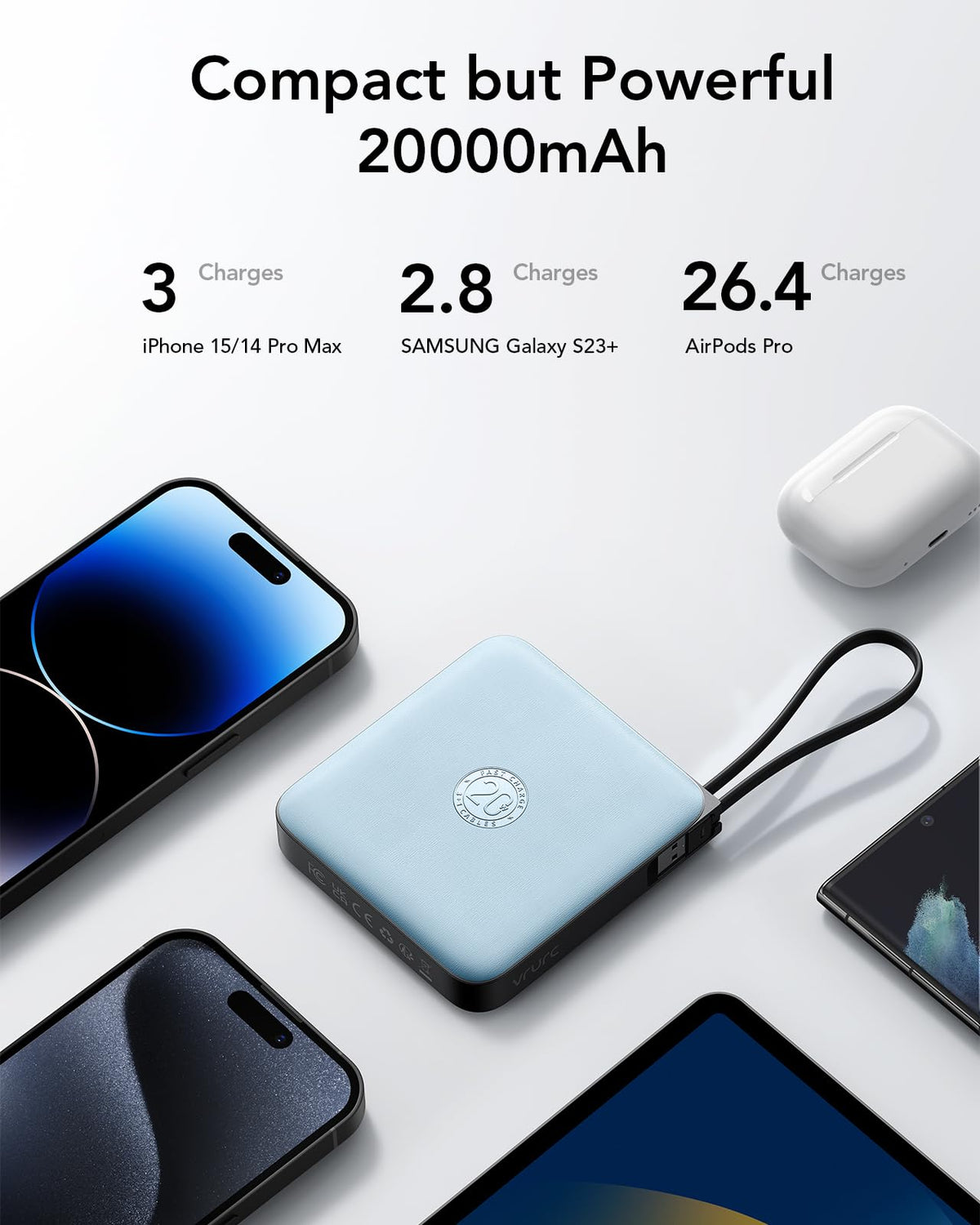 Portable Power Bank, 20000Mah Fast Charging Phone Charger With 4 Built-In Cable, 22.5W Usb C Battery Pack,Small & Slim, Led Display, For Iphone 15 14 13 Samsung Galaxy S23 Google Lg.Slim Portable Charger Features 3 Output Cables And 1 Fast-Charging Input Cable, Allowing You To Charge A Variety Of Devices, Including Iphone(15/14/13/12 Series Etc), Samsung,And Other Usb C Port Android Phones, As Well As Micro Devices.Charge Your Phone Up To 60% In 30 Minutes With Our Compact Power Bank. Powered By High-Density Lithium Polymer Cells, It Delivers Rapid Charging For Up To 4 Devices At Once. Stay Informed With The Smart Led Display Showing Remaining Power.It Provides 3.75 Charges For Iphone 15 Pro Max,1.5 Charges For Ipad, 2.4 Charges For Your Samsung Galaxy S23 Ultra, 4.33 Charges For Your Google Pixel, One Plus 11 2.4 Charges.Also Can Use For Charging Low Current Devices Like Airpods,Sports Watch Etc.Recharge Our Power Bank In Just 2.5 Hours Through The Built-In Usb-C Cable (18W), Via Usb-C Input (Qc/Pd 3.0) At 18W, Or Use The Built-In Usb Cable For A Full Recharge In 6 Hours (10W).Our Mini Portable Charger Meets Stringent Aviation Safety Standards, With Intelligent Safeguards Against Overcharge, Overvoltage, Overcurrent, Short-Circuits, And Overtemperature. Enjoy Rapid Charging With Peace Of Mind.