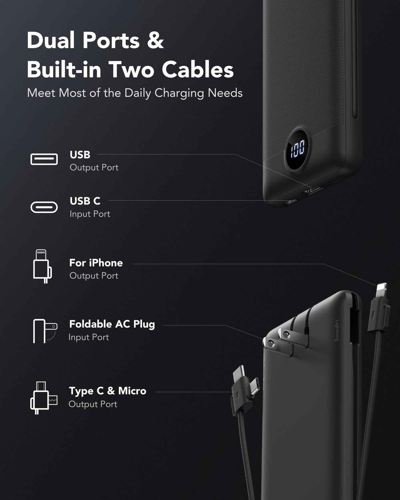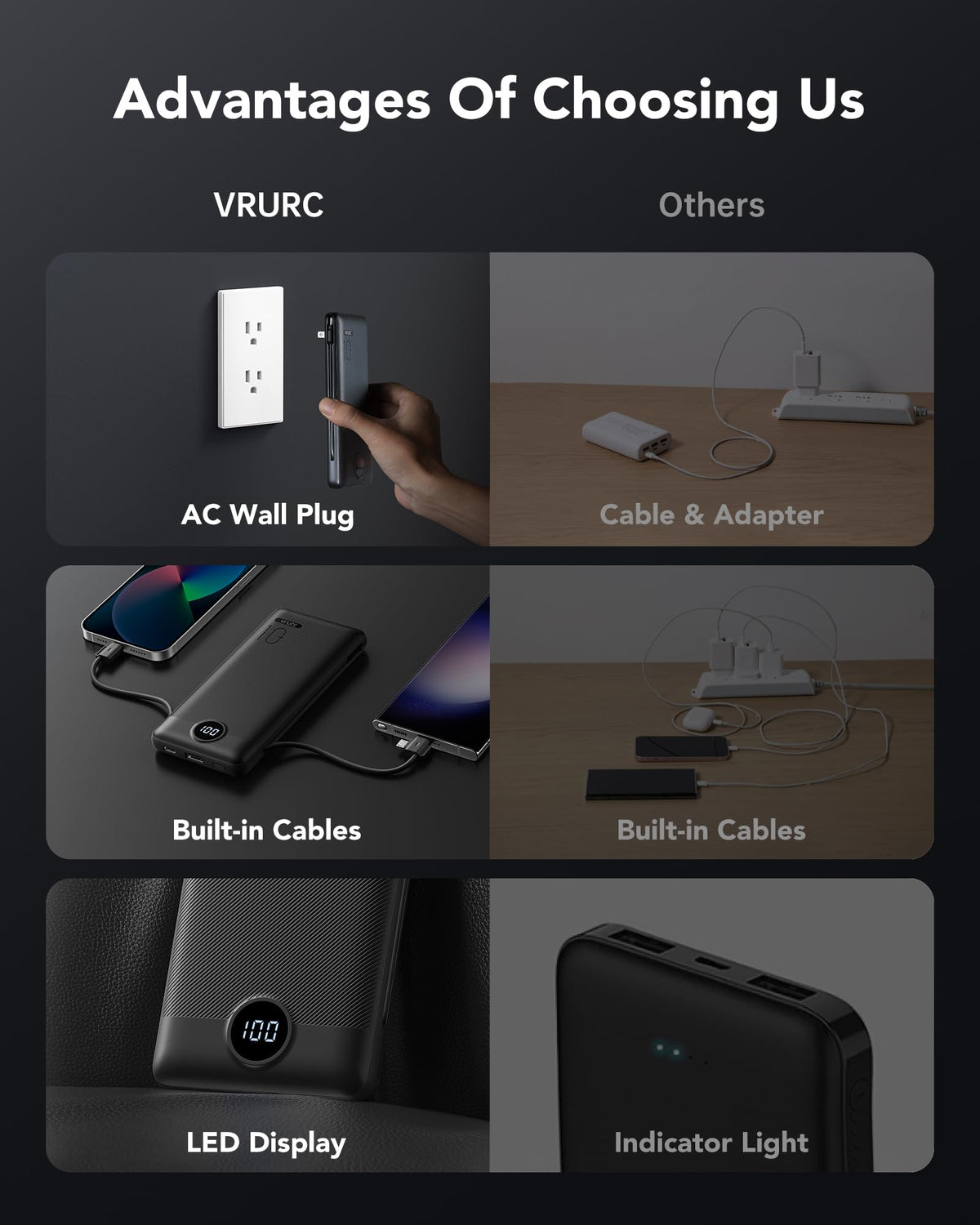 Vrurc Portable Charger With Wall Plug, 10000Mah Slim Portable Charger Built In Cables,Pd 20W Fast Charging Power Bank With Cords