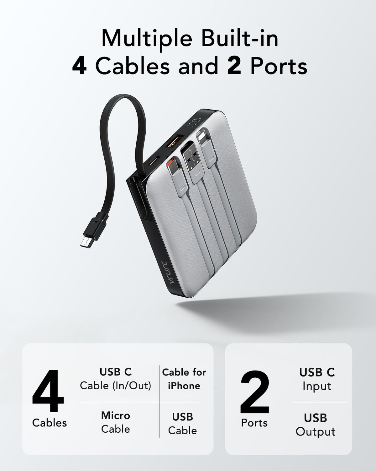 VRURC 10000mAh Portable Phone Charger with 4 Built-in Cables, USB C Fast Charging, PD 20W Mini Battery Pack for iPhone & Samsung - Gray