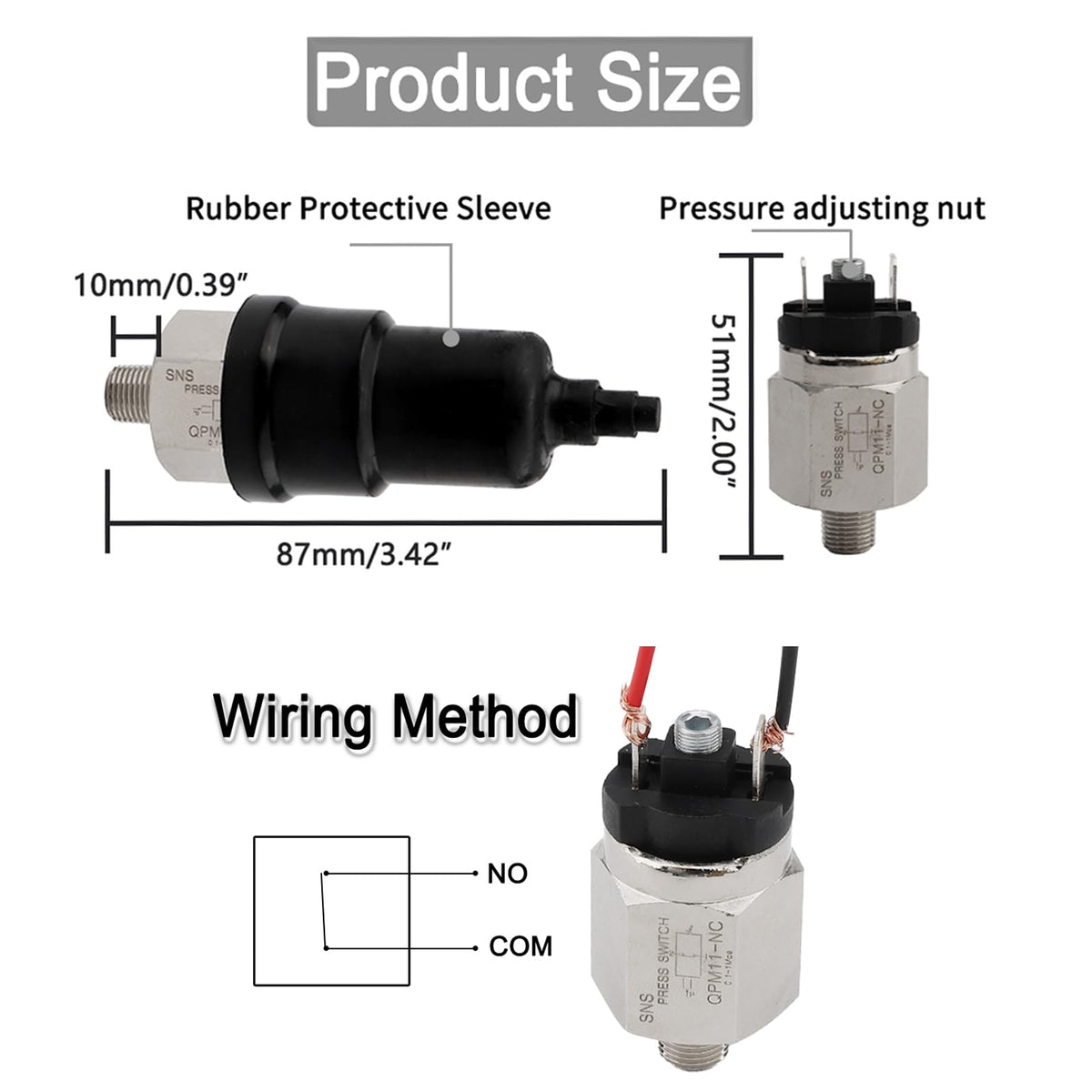 Q: Is this pressure switch suitable for both air and water applications?A: Yes, this pressure switch is designed for air applications but can also be used in some water pressure control scenarios, providing versatility in various environments.