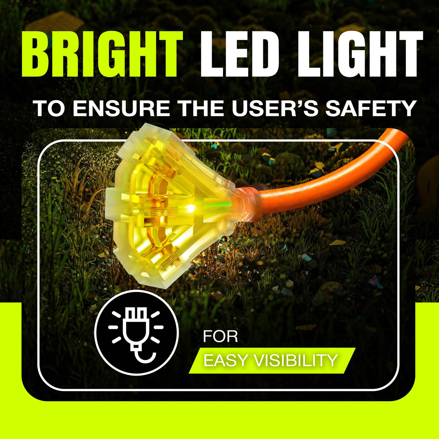 10Ft Power Outdoor Extension Cord & Indoor Waterproof Electric Drop Cord Cable 3 Prong, 3 Outlet, Sjtw, 12 Gauge, 15 Amp, 12