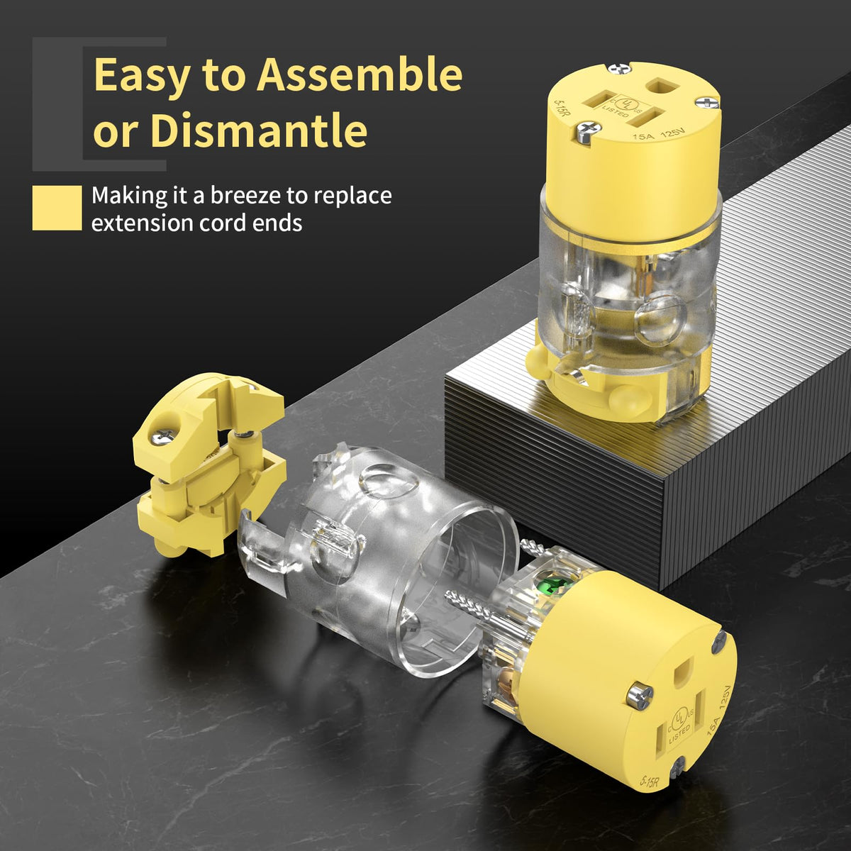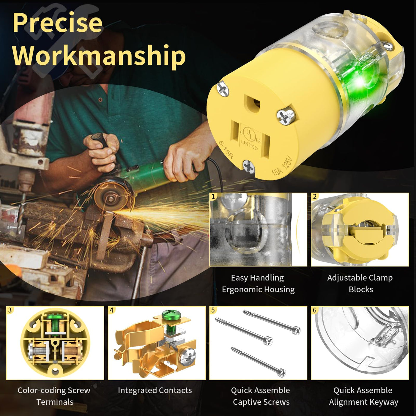 The Illuminated Nema 5-15 Female Plugs Feature A Green Neon Indicator For Operational Status, Enhancing Safety In Low-Light Conditions. These Ul-Listed Cord Caps Ensure Safe, Grounded Connections, While Their Ergonomic Design, Quick Assembly Mechanisms, And Adjustable Cord Clamps Facilitate Easy Use And Long-Lasting Performance, Ideal For Making Or Repairing Extension Cords In A Variety Of Settings≪Br /≫≪Br /≫Specifications≪Br /≫≪Br /≫Description: 2-Pole, 3-Wire Grounding≪Br /≫Rating: 15A 125V≪Br /≫Nema: 5-15P/5-15R≪Br /≫Wire Gauge: 18-12 Awg