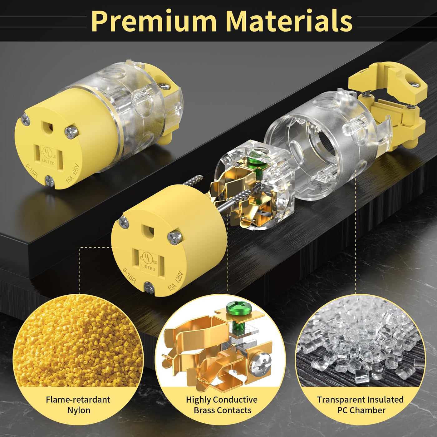 Q: What makes these plugs a durable choice for extension cords?A: These illuminated NEMA 5-15 female plugs are built with sturdy nylon and PC housing, ensuring long-lasting performance. The brass plug blades and connector contacts enhance durability, making them reliable for frequent use in various settings, from homes to industrial applications.