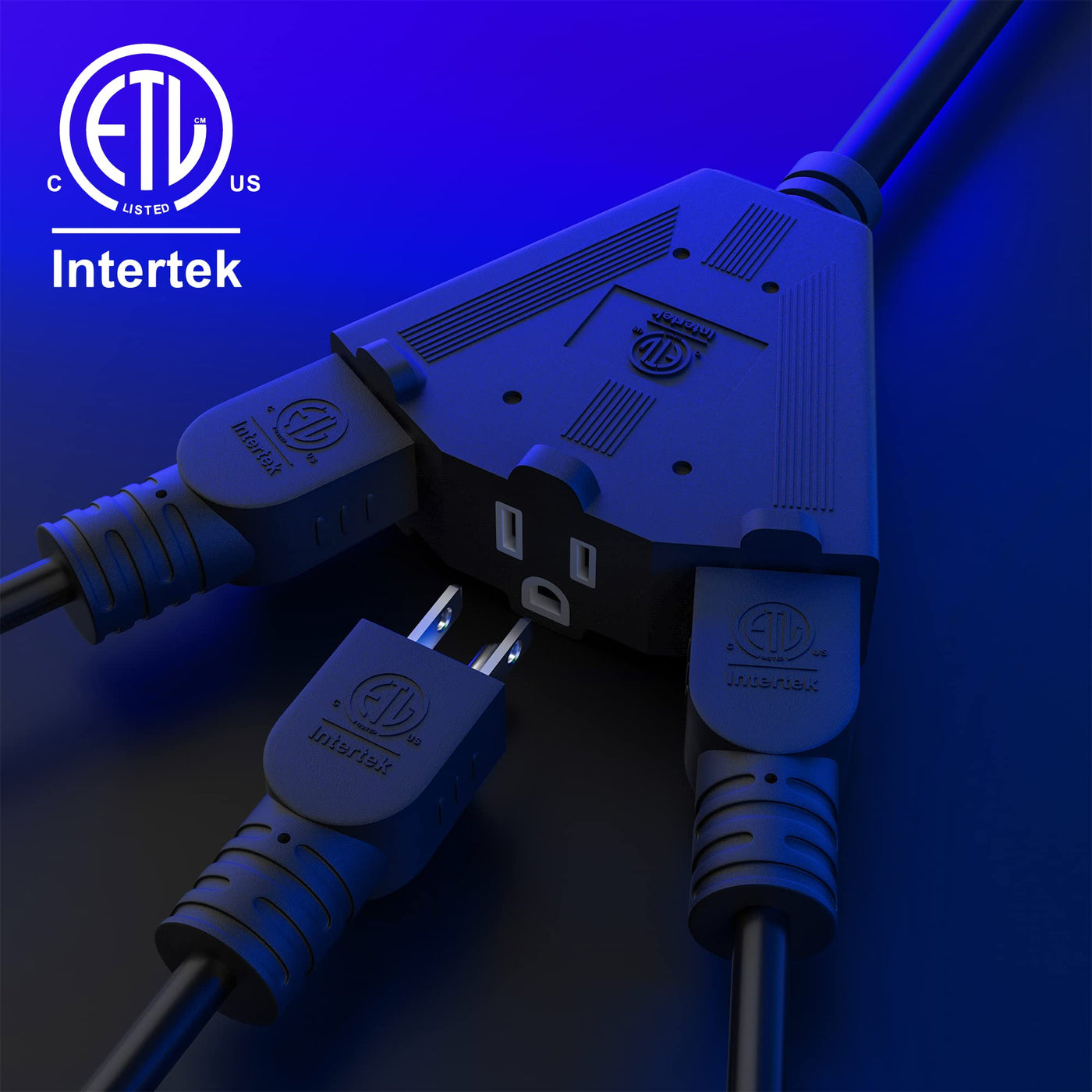 Outdoor Extension Power Cord Convert 1 Outlet Into 3 Grounded. Heavy Duty Cord Features High- Quality 14Awg X 3 Copper Wire Cores And Flexible Blank Pvc Jacket. 3-Pronged Power Cable With 3 Ac Outlets (Fan-Shaped Design For More Space Saving), Nema 5-15P To Nema 5-15R, Etl Listed. Sjtw, 14Awg Durable Wire X 3C, 15 Amp, 125 Volt, 1875 Watt.
