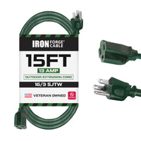 Blends Into Landscaping - This Dark Green Extension Cord 15 Ft Blends Perfectly Into Your Exterior Landscape And Is Designed For Outdoor Use. Great For Outdoor Light Decorations, As Well As Household Appliance, Leaf Blower, Lawnmower, Landscaping, Gardening, And Much More. Perfect For Powering Multiple Devices At Once.Weatherproof & Heavy Duty: With Sjtw Rated For Rugged Outdoor Use, This 15Ft Green Electrical Cord With 3 Prongs Features A High Quality Vinyl Jacket, That Protects The Cord Against Water, Snow, Corrosion, And Sunlight. Flexible In Cold Temperatures.Reinforced Blades: The Nickel-Coated Protects Prongs From Bending Or Breaking, And Help Secure The Plug Firmly In Place. This Ensures That The Cord Functions Well, Stays In Place, And Remains In Good Condition, And Helps This Cord Last You For Years.Ul Certified - 16 Gauge/16 Awg Extension Cord, 3 Wire Grounded Plug, 15 Foot, 13 Amp, 125 Volt, 1625 Watt. Temperature Range: -40?F To +140?F.100% Satisfaction Guaranteed: Us Veteran Owned - Iron Forge Cable, A U.S. Veteran-Owned Business, Stands Behind Its Extension Cords. If Any Issues Arise, A Replacement Will Be Given.