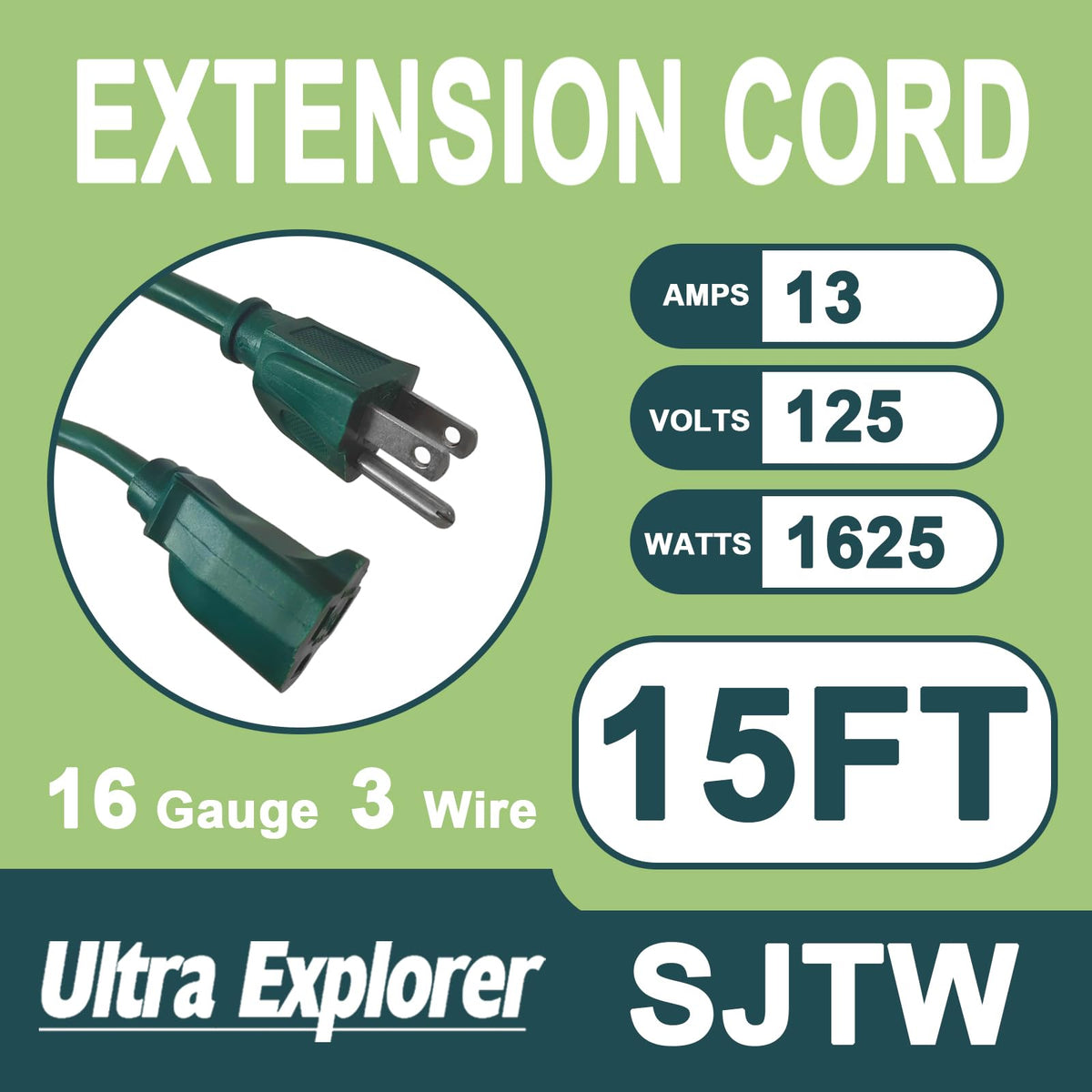 Ultra Explorer 16 Gauge 3 Prong Extension Cord Is Designed To Deliver Robust And Dependable Power For A Variety Of Applications.There Are Two Color: Black/Green. Features A 3-Prong Grounded Plug That Reduces The Risk Of Electrical Shocks And Ensures A Secure Connection. You Can Trust Our Extension Cord To Deliver Power Safely And Efficiently.The 16 Gauge Extension Cord Ensures Efficient Power Delivery Without Voltage Drops, Making It Ideal For High-Power Appliances And Tools.With A Flexible Vinyl Jacket That Protects Against Moisture, Abrasion, And Direct Sunlight, It Withstands Extreme Weather Conditions Ranging From -40F To +140F. Whether It'S The Heat Of Summer Or The Chill Of Winter, Our Cord Remains Resilient, Ensuring Reliable Performance Year-Round.At Ultra Explorer, We Foster A Culture Of Excellence, Innovation, And Integrity That Defines Who We Are And How We Conduct Business. Our Commitment To These Core Principles Shapes Every Aspect Of Our Operations, From Product Development To Customer Service.