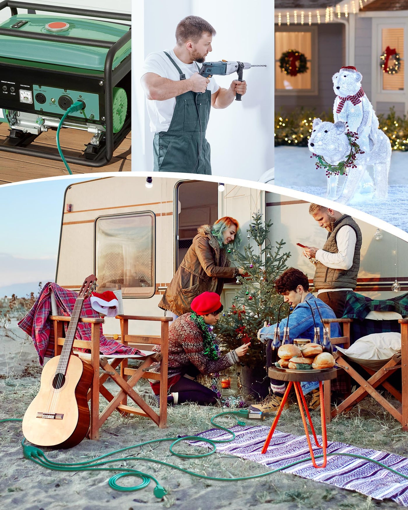 Q: What safety features does this extension cord include?A: Each outlet plug comes with a safety cover that protects against rain, snow, and dust, ensuring safe usage outdoors and preventing accidental contact.