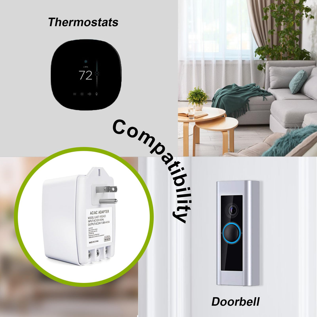 Q: What devices are compatible with the 24V 40VA Transformer?A: The 24V 40VA Transformer is compatible with various devices including Honeywell, Nest, Ecobee, and Sensi smart thermostats, as well as Ring Video Doorbell, Ring Video Doorbell 2, Ring Video Doorbell Pro, and Nest Skybell doorbells.