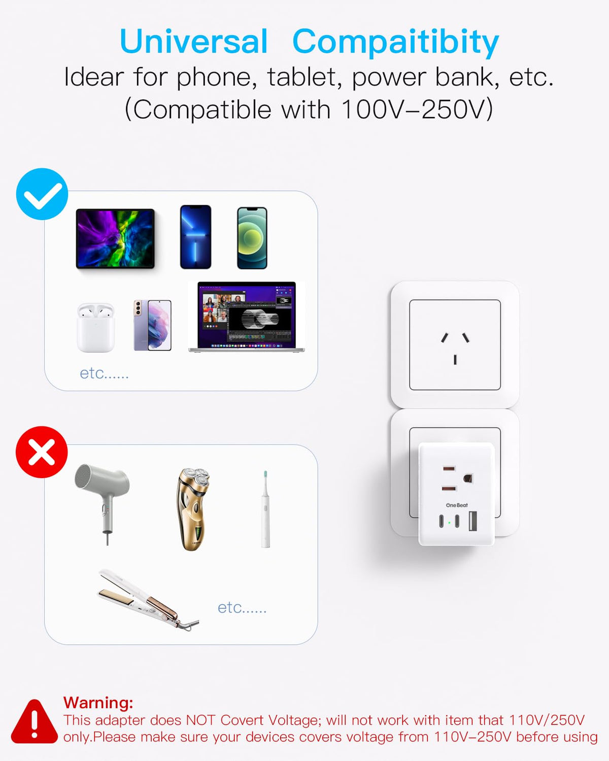 Q: Is the Australia Travel Adapter compatible with devices that require high voltage?A: The Australia Travel Adapter is designed for devices operating within a wide voltage range of 100V to 250V. However, it is important to check if your high-voltage devices, such as hair dryers or curling irons, support this voltage range or use a separate voltage converter.